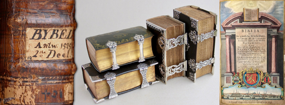 Dit is onze digitale etalage voor zeldzame of bijzonder fraai uitgevoerde Bijbels, zoals met edelmetaal beslag, handgekleurde titelbladen en geografische kaarten. Pronkstukken die het hart van menig bibliofiel sneller laat kloppen.