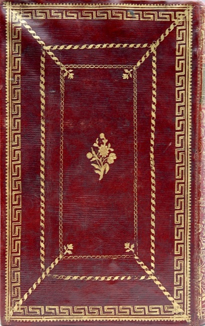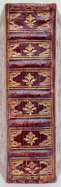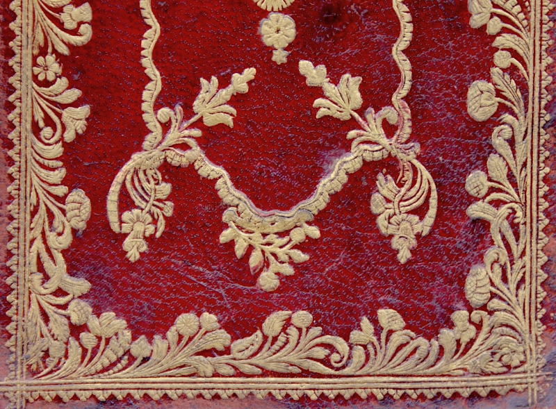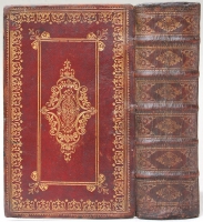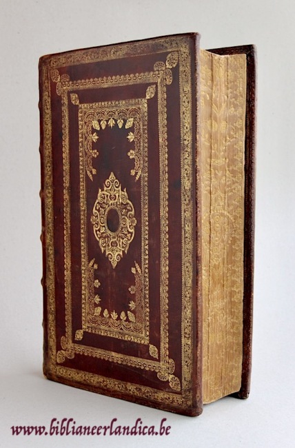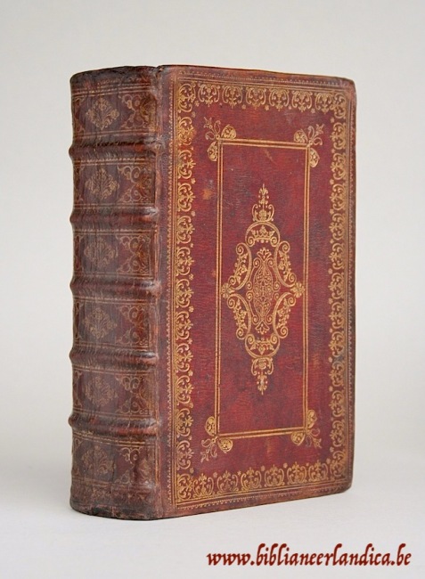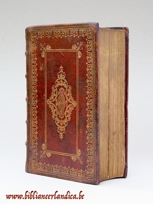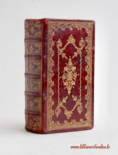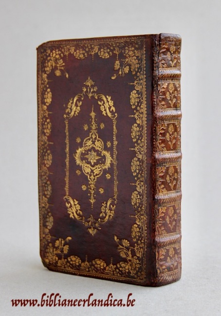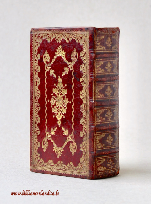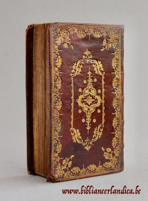 Binding: In duodecimo (12°); origineel goud-bestempeld leer met ribben, vergulde snede en licht geciseleerd boekblok. Op zowel de platten als de rug een aantrekkelijk patroon van ranken, bloemen en geometrische motieven.