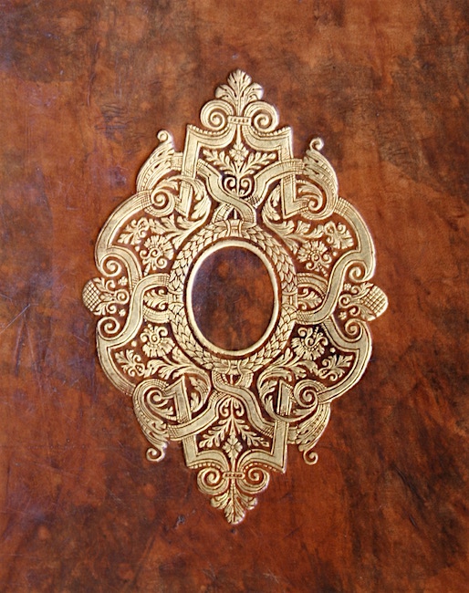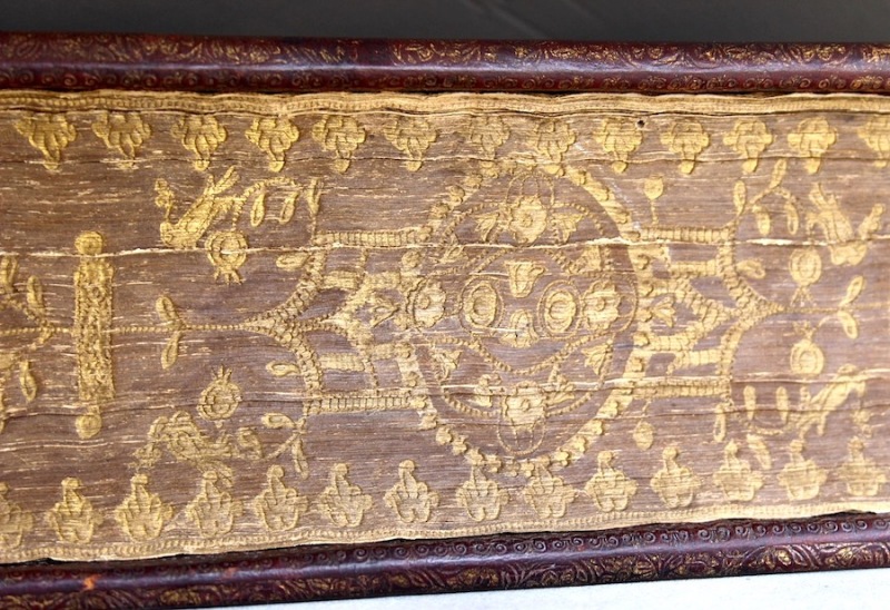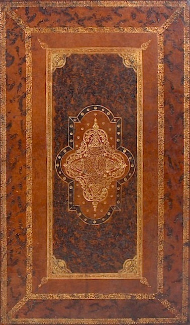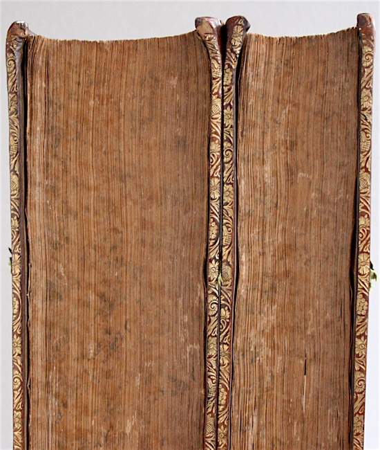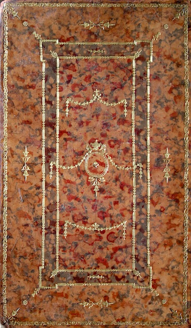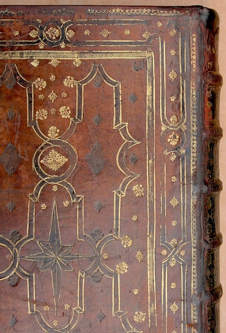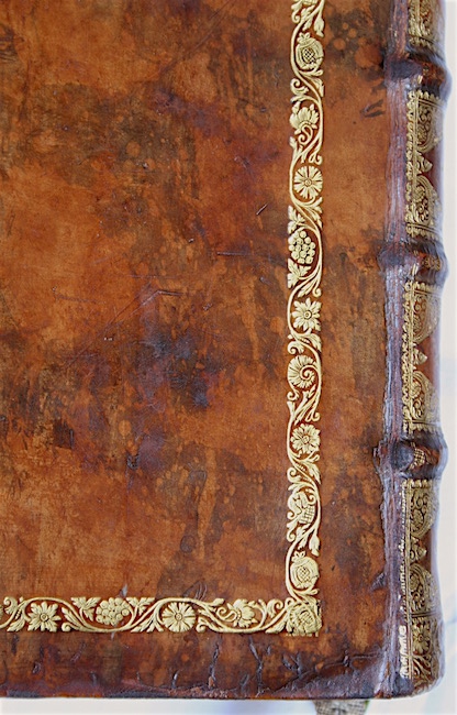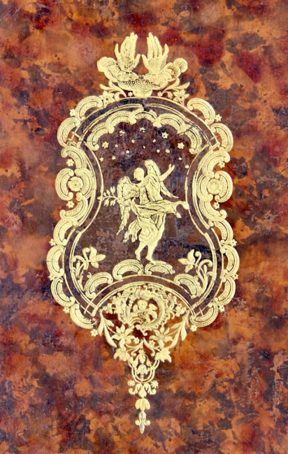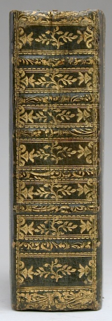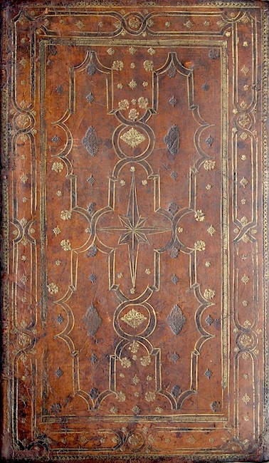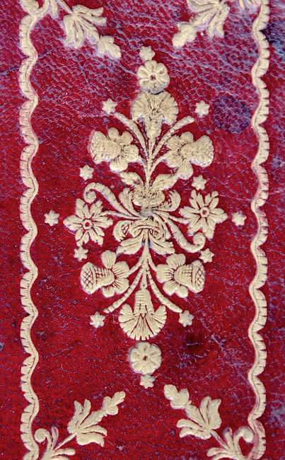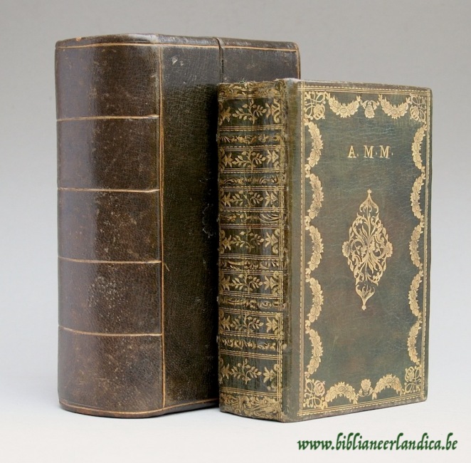 Binding: In duodecimo (12°); origineel goud-bestempeld leer met ribben, vergulde snede en licht geciseleerd boekblok. Op zowel de platten als de rug een aantrekkelijk patroon van ranken, bloemen en geometrische motieven.