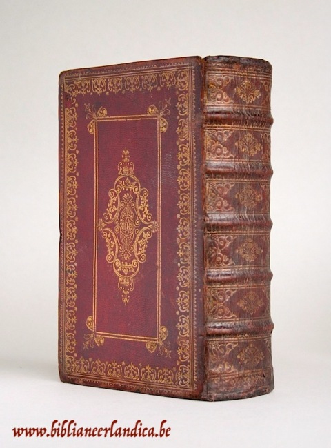 Binding: In folio (2°), 2 delen in 1 boekband. Contemporain, prachtig gedecoreerd kalfsleer met rijke goudstempeling op rug en platten. Goudstempeling platten: centraal groot ornament met bloemen en ranken, omlijst door een driedubbel kader. Het binnenste kader bestaat uit een rand van kwastjes en bloemen waarbij het binnenvak aan de onder- en bovenkant versierd is met het karakteristieke boogje en een verzameling van verschillende florale motieven. Het boekblok met vergulde sneden,  rijkelijk geciseleerd met een patroon van bloemen, ranken en vogels, schitterend in harmonie met de versieringen op de boekband. Rug verdeeld in 7 compartimenten, waarvan elk bestempeld met 4 hoekstempels en fijne florale figuurtjes; 1 compartiment met titelaanduiding.