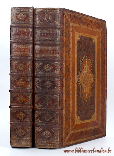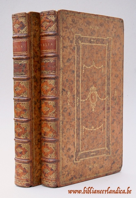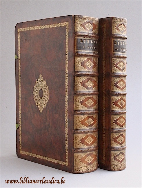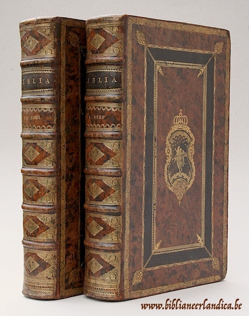 Titel: BIBLIA. Dat is gantsche H. Schrifture, […] Uitgever: Te Dordrecht: By Hendrick en Jacob Keur; en T’Amsterdam, by Marcus Doornick in compagnie. Vertaling/Benaming: Statenbijbel of Statenvertaling. Waarbij ingebonden: zes plooikaarten door Bastiaan Stoopendaal en 128 dubbelbladige gravures naar de Bruyn, Coninxloo, Diepenbeeck, Heemskerck, Hondecoeter, Rubens, Vinckboons, Vos, Vouet, en andere. Alle kaarten oud-ingekleurd en gedeeltelijk met goud gehoogd. Binding: In groot-folio (2°), 2 delen; contemporain leer met rijke goudstempeling op rug en platten; rug over 8 ribben. Goudstempeling: Alle platten bestempeld met drie kaders van florale rolstempels. Marmering in buitenste en binnenste kaders. Centrale stempeling in de vorm van ornamentele- en kroonfiguren in evenwijdig, dubbellijnig kader waarin bloemenfiguurtjes. Ruggen verdeeld in 8 compartimenten, waarvan elk bestempeld met 4 hoekstempels en centraal een ruitvormige stempel met floraal motief. 2 compartimenten met titel- en deelaanduiding. BOEKBINDERIJ: Eerste stadhouderlijke binderij te ’s Gravenhage (ca. 1722-1793) – Storm van Leeuwen, J. (1976); De achttiende-eeuwse Haagse boekband in de Koninklijke Bibliotheek en het Rijksmuseum Meermanno-Westreenianum (1976); p. 55-73, p. 389 (rol XVI), p. 391 (stempel 61), p. 392 (stempels 77, 104, 114, 120). Storm van Leeuwen, J. (2006); Dutch Decorated Bookbinding in the Eighteenth Century, vol. IIA, p. 67-101; vol. III, p. 678 (3), 798 2/3.