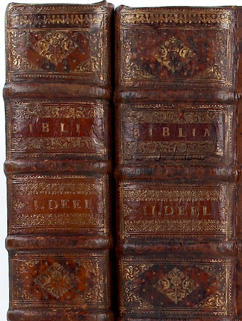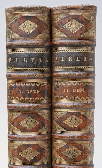 Titel: BIBLIA. Dat is gantsche H. Schrifture, … Uitgever: Te Dordrecht. Bij Pieter en Jacob Keur Vertaling/Benaming: Statenbijbel of Statenvertaling. Waarbij ingebonden: de prentbijbel van Pieter de Hondt (1728) met 214 gravures door Gerard Hoet, Arnold Houbraken en Bernard Picart. Binding: In folio (2°), 2 delen; contemporain, gemarmerd leer met goudstempeling op rug en platten; rug over 7 ribben, zwarte titelschildjes met goud-opdruk. Goudstempeling platten: platten omkaderd met florale rolstempel en centraal medaillon. Ruggen verdeeld in 8 compartimenten, waarvan elk bestempeld met 4 hoekstempels en centraal een ruitvormige stempel met floraal motief; 1 compartiment met titel- en deelaanduiding. BOEKBINDERIJ: ‘Acorn bindery’ te Utrecht (ca. 1738-1764). Van deze boekbinderij zijn een 18-tal min of meer luxe-boekbanden bekend, grotendeels in gespecialiseerde, publiekelijke bibliotheken, zoals de Koninklijke Bibliotheek in ’s Gravenhage (NL).  – Storm van Leeuwen, J. (2006); Dutch Decorated Bookbinding in the Eighteenth Century, vol. IIB, p. 767-771. Ruggen: rolstempels – I en IV; stempels – 7. Platten: rolstempels – I.