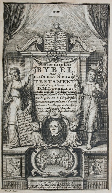 Binding: In folio (2°), 2 delen; oorspronkelijk gemarmerd leer met rijke goudstempeling op rug en platten, vergulde sneden. Goudstempeling: centraal getailleerd medaillon waarin een cherubijn met een tak in de hand. Boven het medaillon twee gestileerde handen als uitstraling van hemelse bescherming of goddelijke zegen en goedkeuring. Prominent aanwezig zijn de vergulde pilaren met cherubijnen aan de top. Bovenaan prijkt een boog met de tekst: En dit is het woord dat onder u verkondigt is (1Petr. 1:25, SV). De buitenste, brede omlijsting is in goudstempeling met figuurtjes van fauna en flora. De ruggen zijn verdeeld in compartimenten, waarvan elk bestempeld met 4 hoekstempels waarop engelenkopjes; 2 compartimenten met titel- en deelaanduiding.