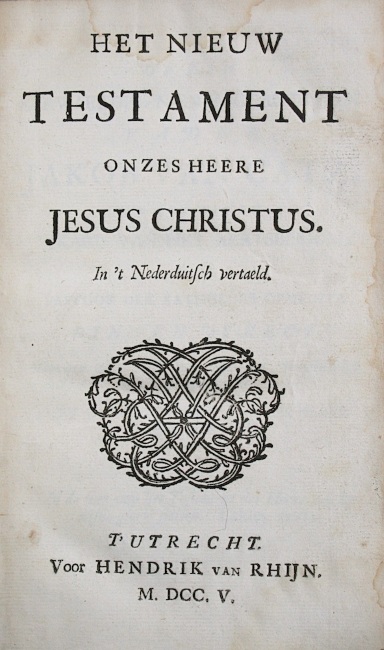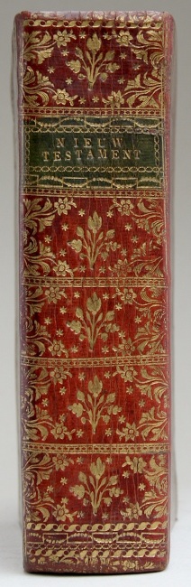 Titel: HET NIEUWE TESTAMENT; Onzes Heere Jesus Christus, […] Uitgever: T’ Utrecht: Voor Hendrik van Rhijn Vertaling/Benaming: Vertaling van Andreas van der Schuur (Oud-katholiek) Binding: In octavo (8°); contemporain rood marokijnleer en vergulde snede. Platten versierd met kaders in ornamentele motieven en centraal bloemmotief in goudstempeling. Rug verdeelt in 5 compartimenten waarvan elk bestempeld met 4 hoekstempels en centraal bloemmotief; groen titelschild. BOEKBINDERIJ: Onbekend