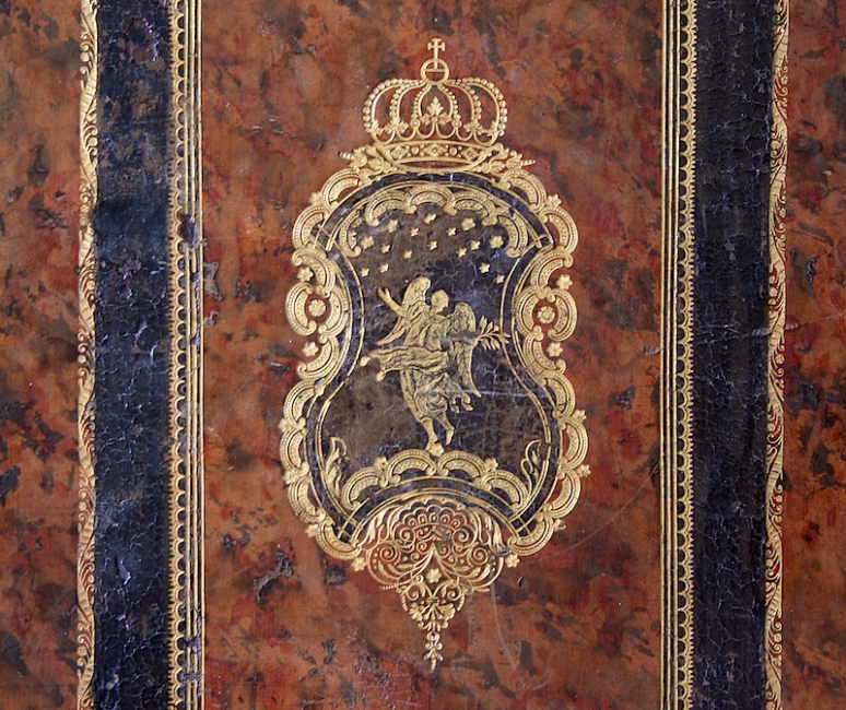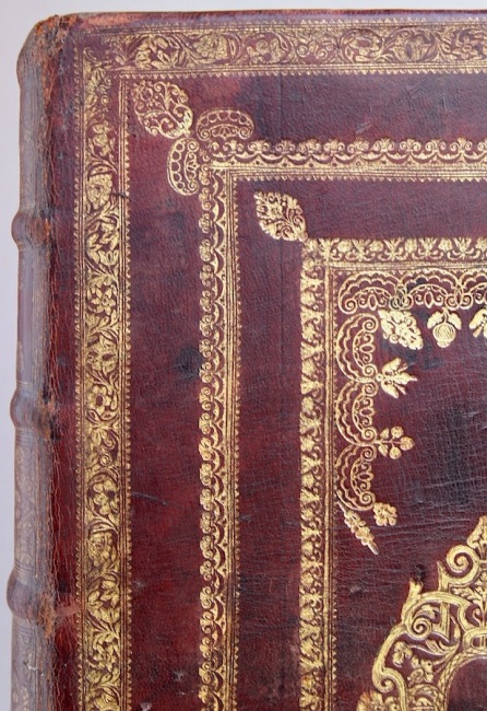 Binding: In groot-folio (2°), 2 delen; contemporain gemarmerd leer met fijne goudstempeling op rug en platten. Goudstempeling platten: Buitenste omlijsting in goudstempeling met florale motieven; binnenste, dubbele kader, afgeboord met bewerkte goudlijnen. Centraal ovaal met bloemfiguurtje en decoraties in de vorm van guirlandes. Ruggen verdeeld in 8 compartimenten waarvan elk 4 hoekstempels met florale motieven; 2 compartimenten met titel- en deelaanduiding.