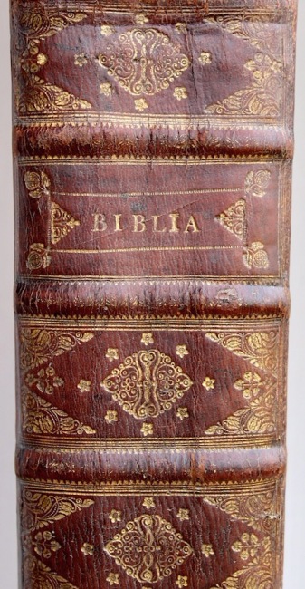 Titel: BIBLIA; Dat is, De gantsche H. Schrifture, […] Uitgever: Dordrecht: By de Weduwe van wijlen Ian Barentsen Smient; in compagnie met Helmich van Cappel te Gorinchem Vertaling/Benaming: Statenvertaling Binding: In octavo (8°); rug over 5 ribben/nerven, rood marokijn met rijke goudstempeling op rug en platten BOEKBINDERIJ: Eerste stadhouderlijke binderij te ’s Gravenhage (ca. 1722-1793). Jan Storm van Leeuwen: “De Haagse binderij met, voor zover bekend, de grootste productie aan semi-luxueus en luxueus bindwerk was die welke naar haar activiteiten voor stadhouder Willem IV de Eerste stadhouderlijke binderij is genoemd. Tot nu toe zijn een kleine honderdtachtig werken gevonden, waarvan de banden door dit atelier vervaardigd werden.” – Uit ‘De achttiende-eeuwse Haagse boekband in de Koninklijke Bibliotheek en het Rijksmuseum Meermanno-Westreenianum (1976); p. 55-73, p. 389 (rol XXVI), p. 391 (stempels 22, 43), p. 392 (stempels 80 a b, 114, 120). Storm van Leeuwen, J. (2006); Dutch Decorated Bookbinding in the Eighteenth Century, vol. IIA, p. 67-101; vol. III, p. 798 2/3.
