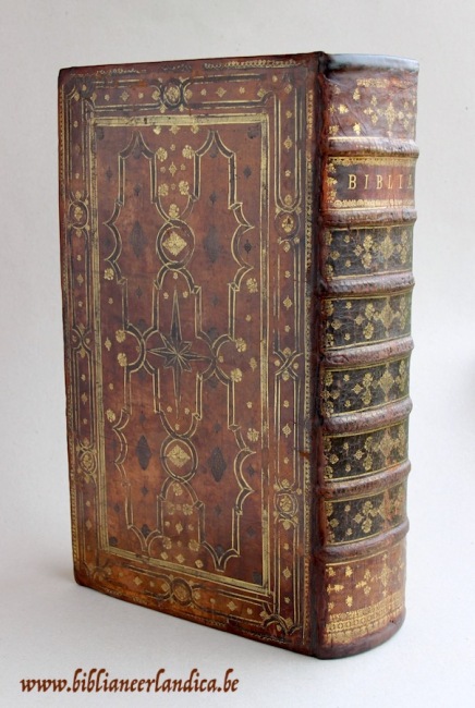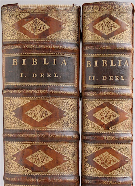 Titel: BIBLIA. Dat is gantsche H. Schrifture, […] Uitgever: Te Dordrecht. Bij Pieter en Jacob Keur Vertaling/Benaming: Statenbijbel of Statenvertaling. Waarbij ingebonden: de prentbijbel van Pieter de Hondt (1728) met 214 gravures door Gerard Hoet, Arnold Houbraken en Bernard Picart. Binding: In folio (2°), 2 delen; contemporain gemarmerd leer met rijke goudstempeling op rug en platten, gemarmerde snede. Goudstempeling: centraal getailleerd en gekroond schild waarin een engel met een tak in de hand. Omlijst met zwarte rand, gevat in decoratieve goudstempeling. Buitenste, brede omlijsting in goudstempeling met florale motieven. Ruggen verdeeld in compartimenten, waarvan elk bestempeld met 4 hoekstempels waarop engelenkopjes; 2 compartimenten met titel- en deelaanduiding. BOEKBINDERIJ: Van Damme-boekbinderij te Amsterdam (1750-1786) – Storm van Leeuwen, J. (2006); Dutch Decorated Bookbinding in the Eighteenth Century, vol. I, p. 460-499. Ruggen: rolstempels – XIX, XXIV, XXIX en XXX; stempels – 8 en 9. Platten: rolstempels – V, IX en XXIX; stempels – 3, 20, 93, 108, 112, 129, 134, 142 en 156.
