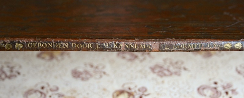 Titel: BYBEL. Dat is gansche H. Schrift, […] Uitgever: Te Gorinchem, By Nicolaas Goetzee, Ordinaris Stadsdrukker Vertaling/Benaming: Statenbijbel of Statenvertaling. Waarbij ingebonden: 12 bijbelkaarten door W.A. Bachiene en 14 prentbladen van A. Houbraken en J. Folkema. Binding: In folio (2°), 2 delen in 1 boekband; contemporain kalfsleer met rijke goudstempeling op rug en platten, vergulde snede. Goudstempeling: Platten bestempeld met twee, grote rechthoekige lijnkaders waarin patronen van elkaar doorsnijdende linten. Binnenste rechthoek met centraal een achthoekige ster i.v.v. een windroos. Omgeven door lintpatronen. Tussenliggende velden bevatten stempels van bloemen en florale motieven. Rug over 7 ribben/nerven. Velden met stempelingen van bloemen; tweede veld met titelaanduiding.  Titelpagina: Letters van opschrift met goud gehoogd. BOEKBINDERIJ: Signatuur op lange rand van het voorplat: ‘Gebonden door J.W. Kannema[n] te Boemel  1760’. Johannes Willem Kanneman uit ‘Boemel’ (Zaltbommel) krijgt in de geschiedenisboeken een vermelding als boekdrukker, uitgever en publicist gedurende de jaren 1744-1763. Hij is echter niet bekend als boekbinder, evenmin dat er een boekbinderij aan zijn bedrijf verbonden was. Deze Bijbel is het enige bekende boek dat een signatuur van de uitgever bevat als bewijs dat Kanneman op zijn minst geëxperimenteerd heeft met mooie, goudgestempelde luxe-boekbanden. Het afgeleverde product bood echter niet de kwaliteit als die van beroemde ateliers uit Amsterdam, ’s Gravenhage of Middelburg. Kanneman deed hiermee een verdienstelijke poging, maar hij beschikte niet over de ervaring en expertise om deze nevenactiviteit succesvol verder te zetten – Niet in Storm van Leeuwen, J. (2006); Dutch Decorated Bookbinding in the Eighteenth Century.
