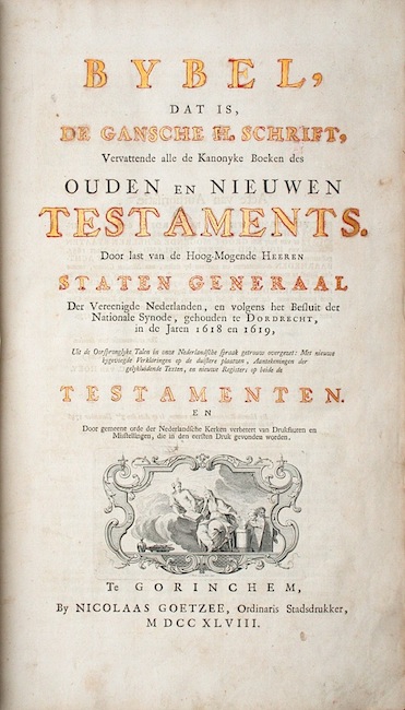 Uitgever: Naam noch plaatsnaam worden in de Bijbel vermeld [uitgegeven door de Weduwe van Nicolaas Goetzee te Gorinchem].