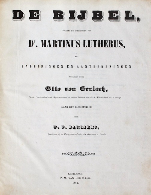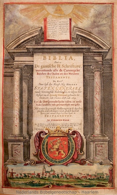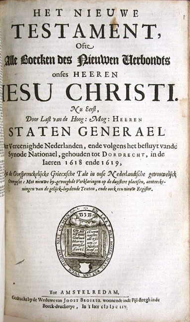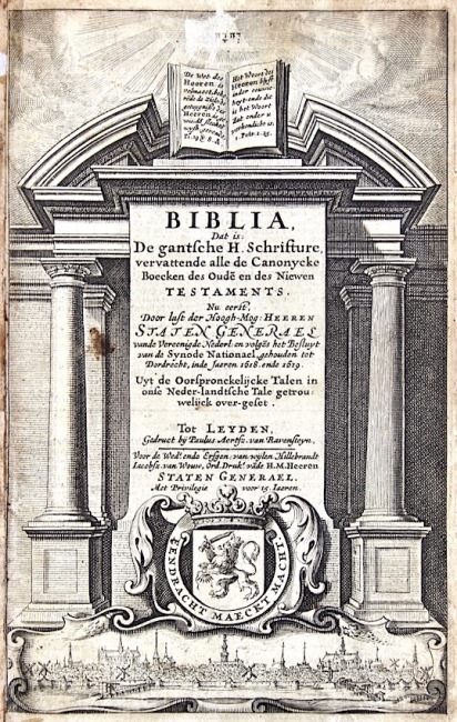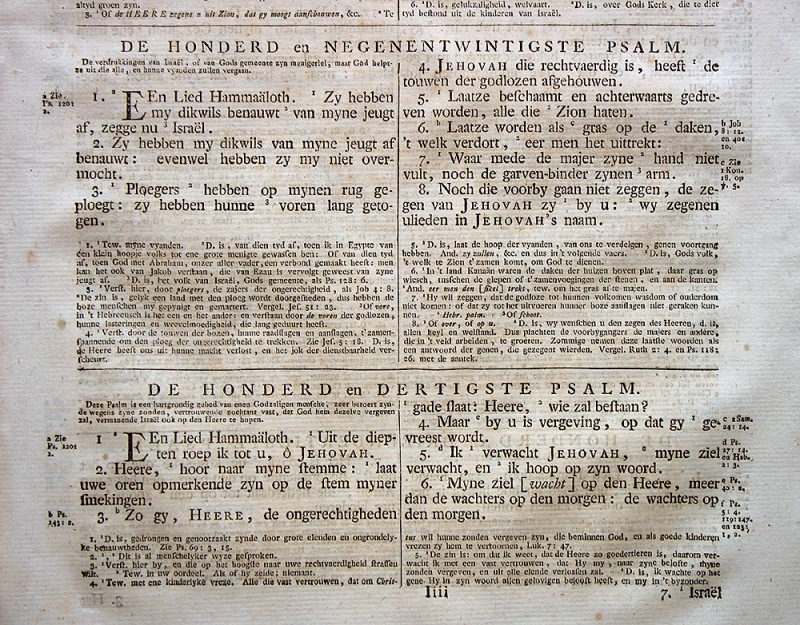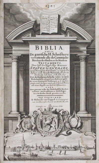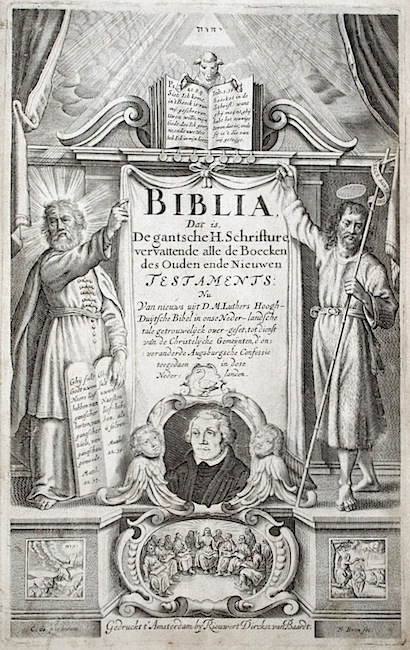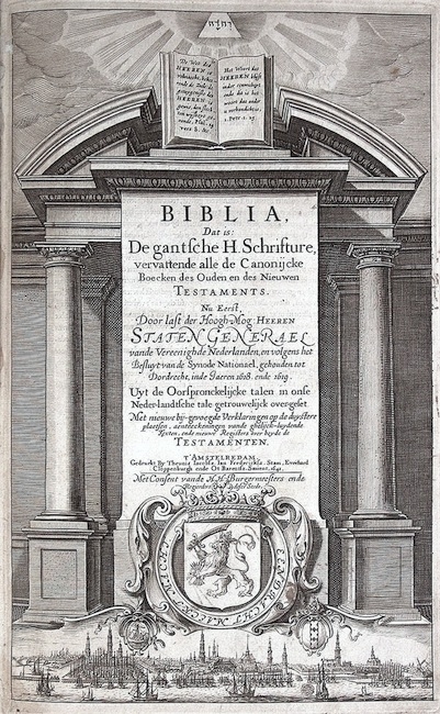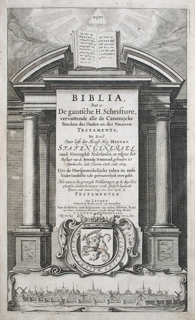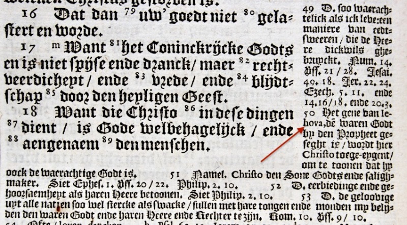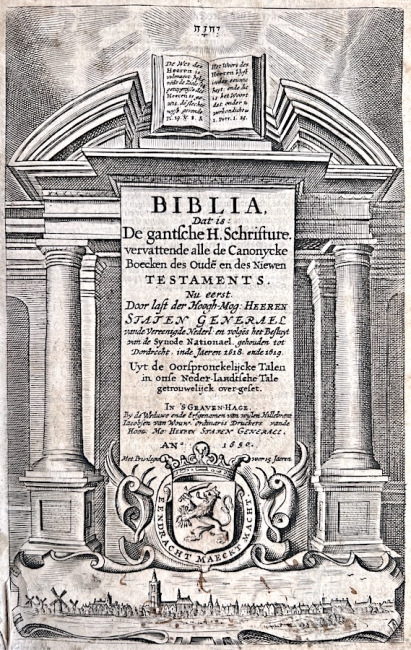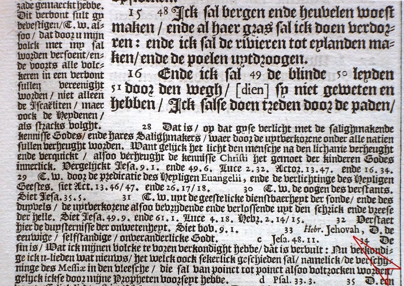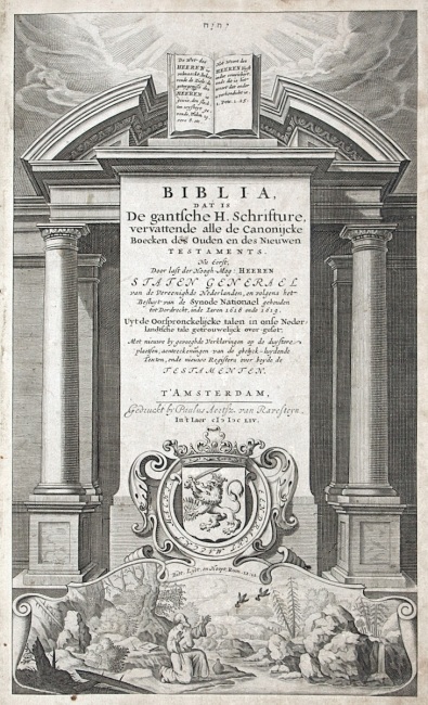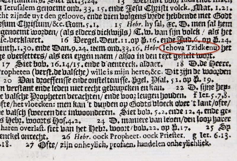 Gebruik Godsnaam: Tetragram verwerkt in titelgravure. Zowel ‘IEHOVAH’, ‘JEHOVAH’ als ‘Jehovah’, ‘Jehova’ en ‘Iehova’ in de kanttekeningen.