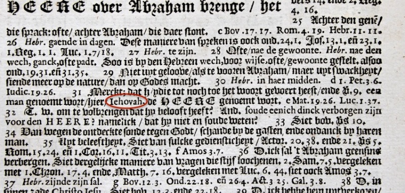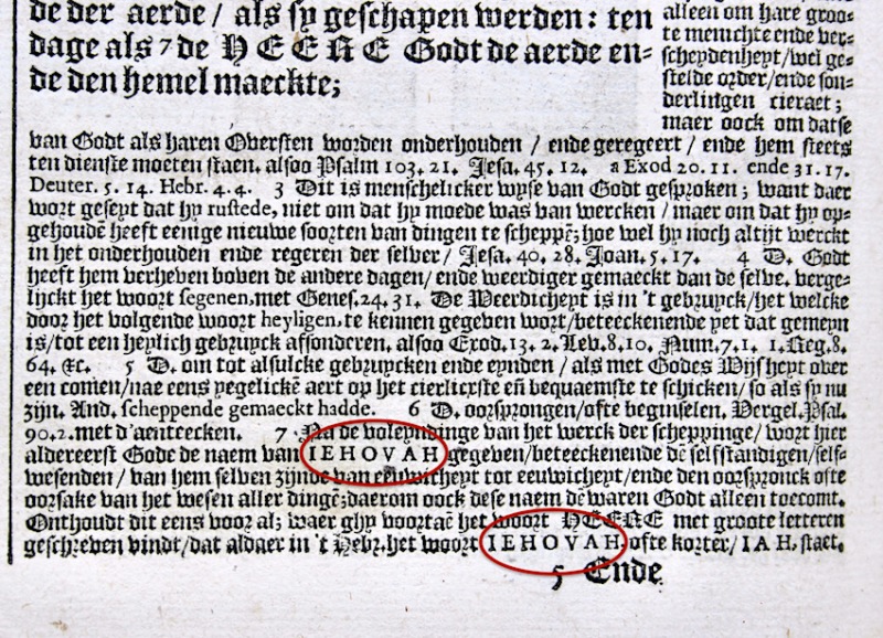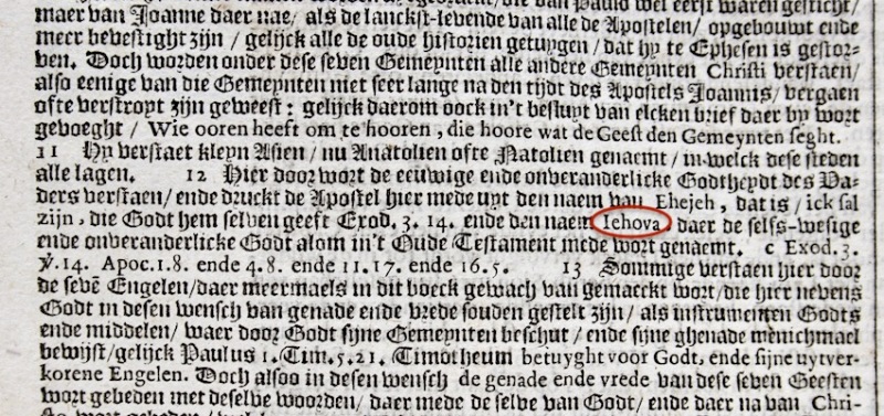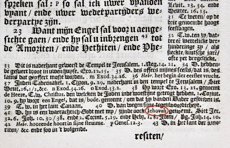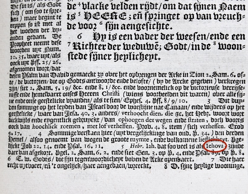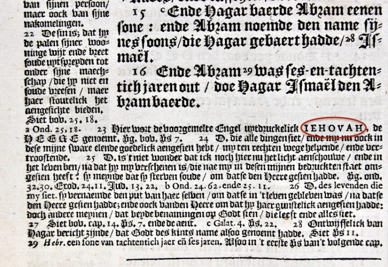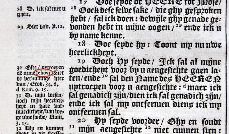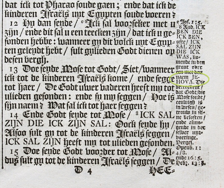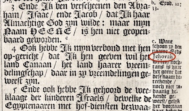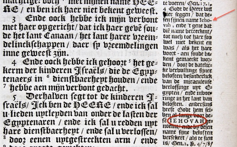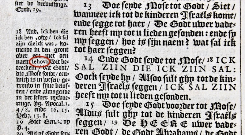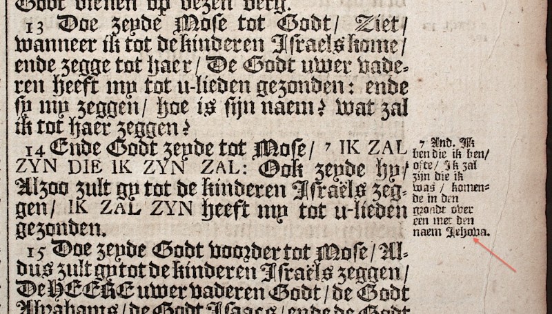 Statenbijbel gedrukt in 1786 in Amsterdam, bij H. Brandt, D. onder de Linden, P. Schouten, J. de Groot, in compagnie (z.g. ‘kerkbankbijbel’ in kwarto). De Godsnaam in de vorm van ‘Jehova’ verwerkt in de kanttekening bij Exodus 3:14: