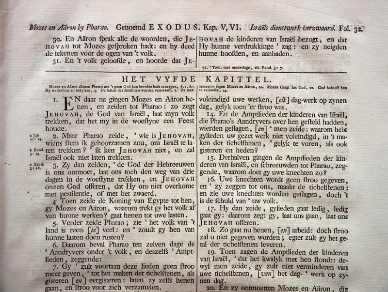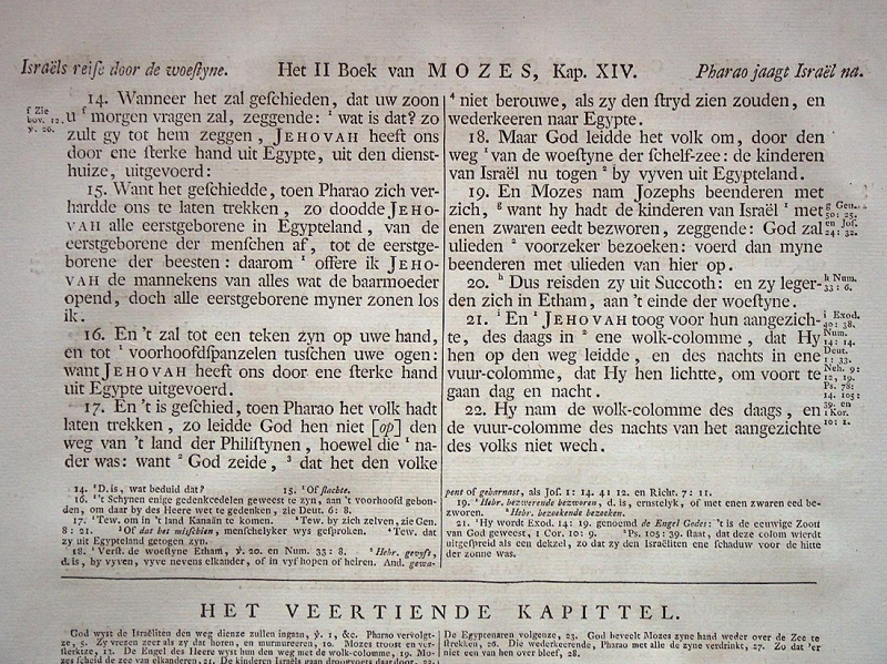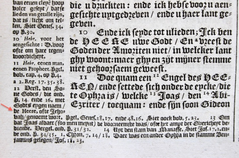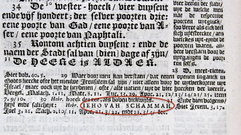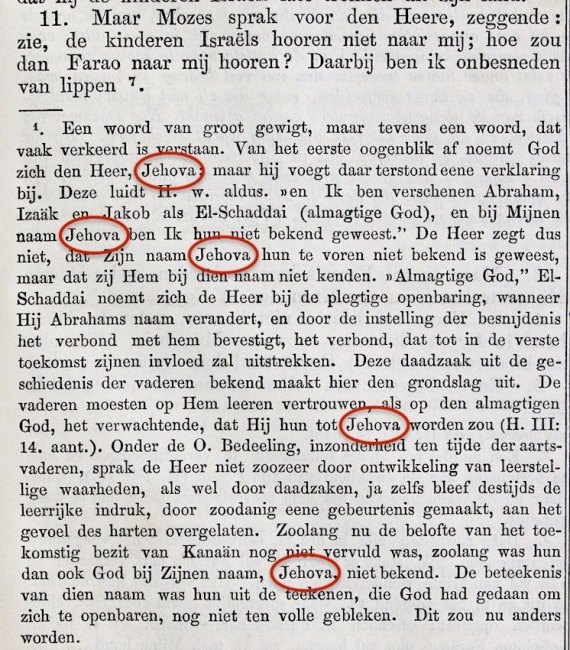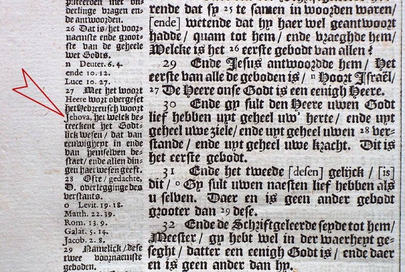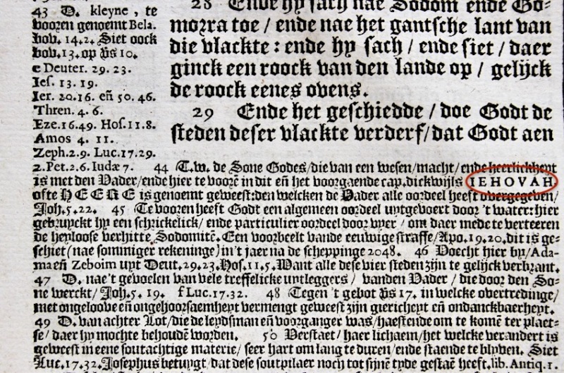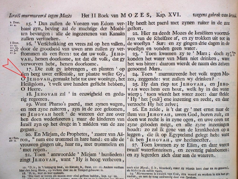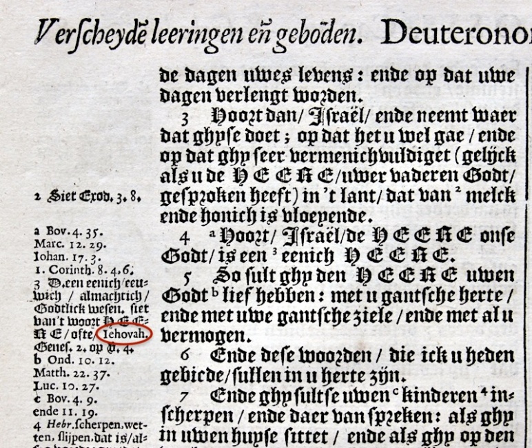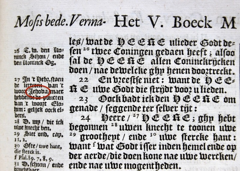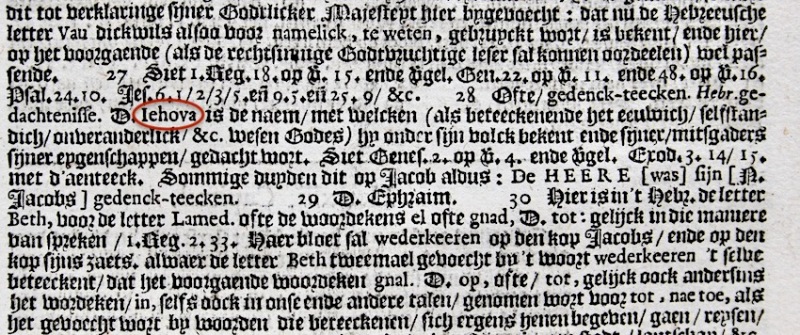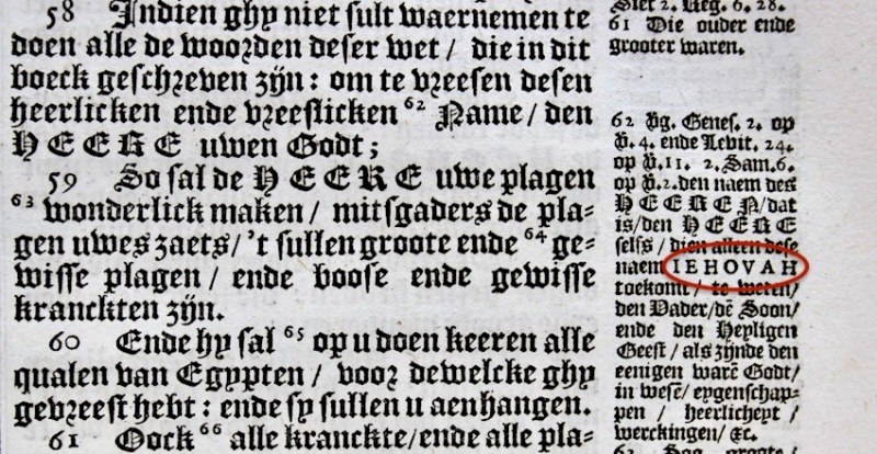 Statenbijbel gedrukt in 1786 in Amsterdam, bij H. Brandt, D. onder de Linden, P. Schouten, J. de Groot, in compagnie (z.g. ‘kerkbankbijbel’ in kwarto). De Godsnaam in de vorm van ‘Jehova’ verwerkt in de kanttekening bij Exodus 3:14: