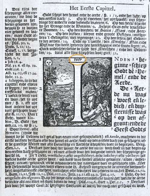 Statenbijbel uitgegeven te Amsterdam, bij Joost Hartgers in 1653. Het Tetragram is verwerkt in de titelgravure en in een gegraveerde hoofdletter. Hierin wordt afgebeeld hoe Adam en Eva op bevel van God (of JHWH) uit de Tuin van Eden verdreven worden:
