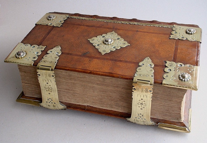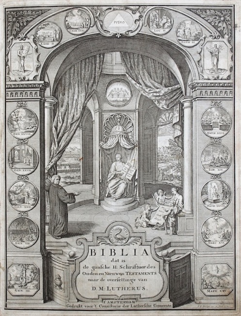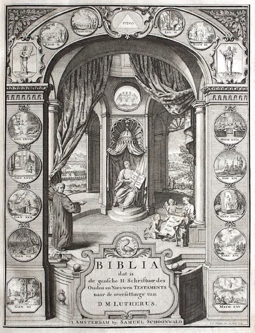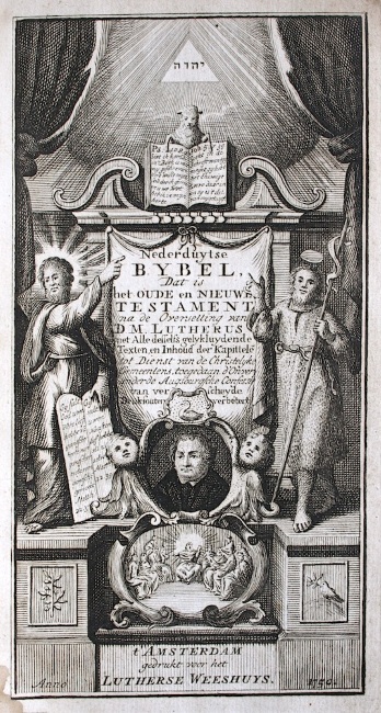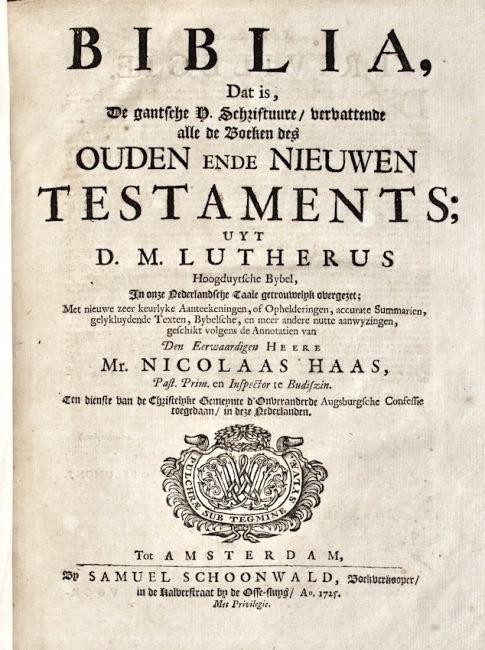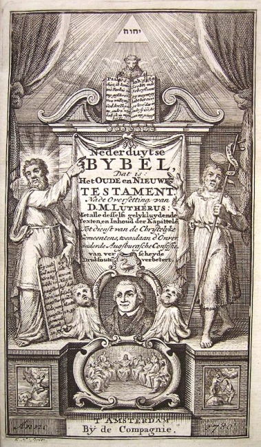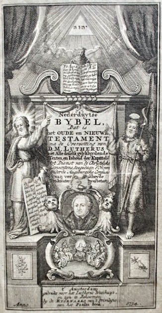 Statenbijbel gedrukt in 1716 bij Pieter Keur (Dordrecht) en Pieter Rotterdam (Amsterdam). Het Tetragram is verwerkt in het drukkersmerk met de afbeelding van ‘de schatgraver’, enkele gravures van L. Causé en N. Gommerse en in een eindornament: