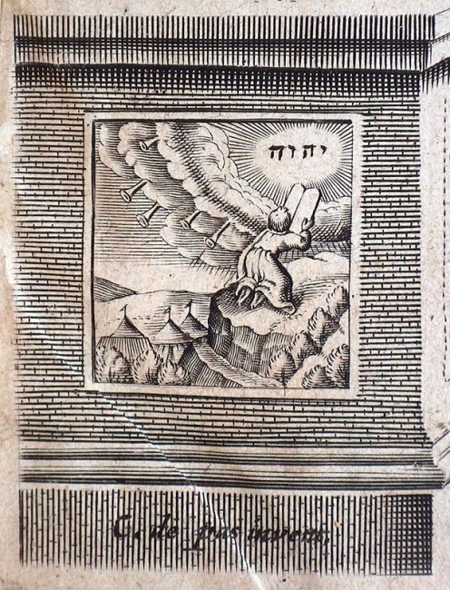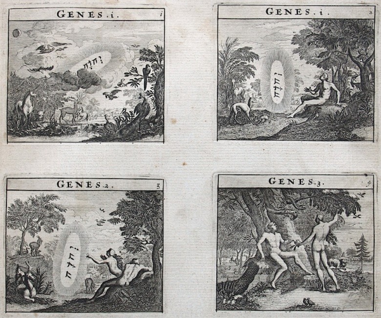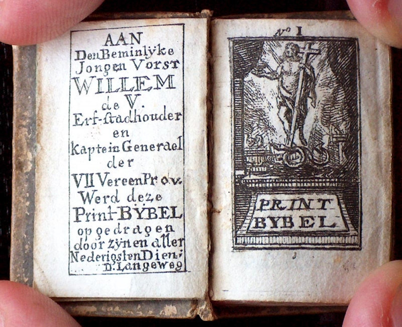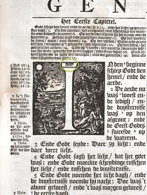 Miniatuurbijbeltje gedrukt bij Petrus Servaas te ’s Gravenhage in 1750 (4,1 x 3,2 cm). Het Tetragram verwerkt in scheppingsgravure: