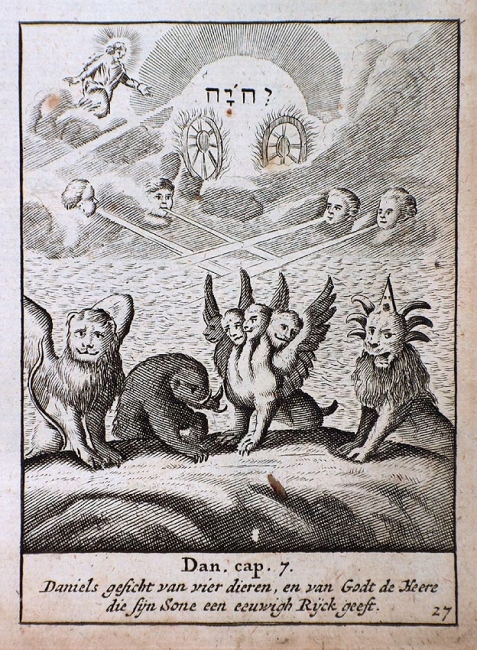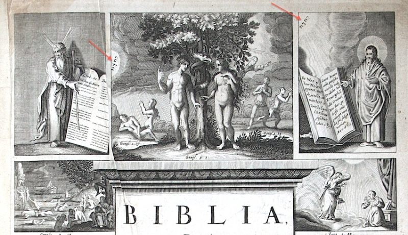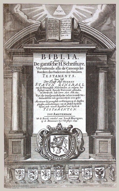 Het Tetragram centraal bovenaan in een driehoek verwerkt in titelgravures van diverse folio-uitgaven (tenzij anders aangegeven) van de Statenbijbel of Statenvertaling :