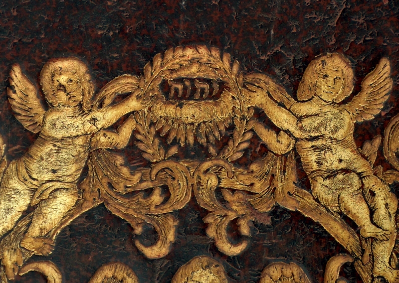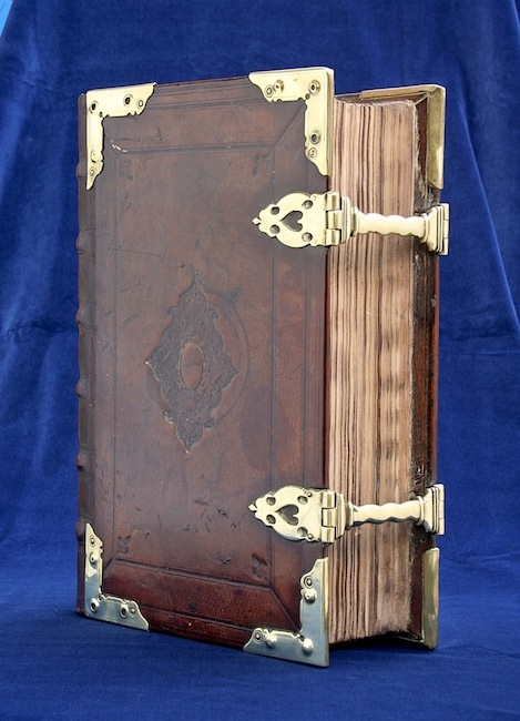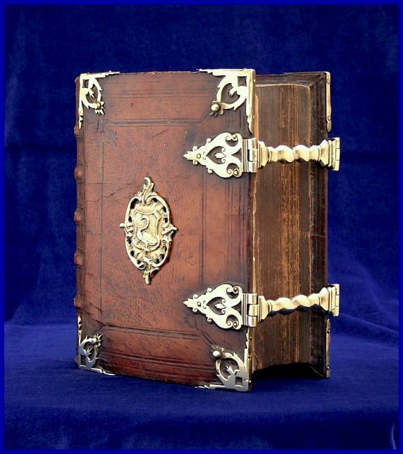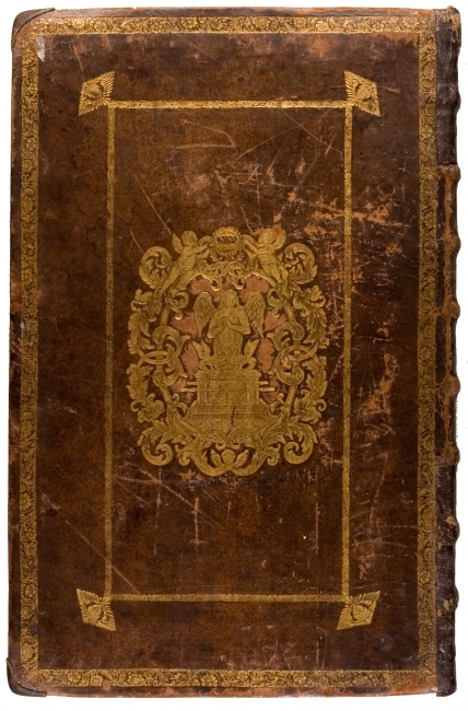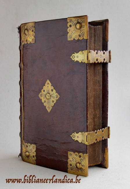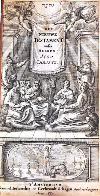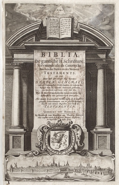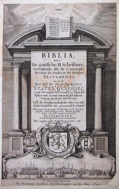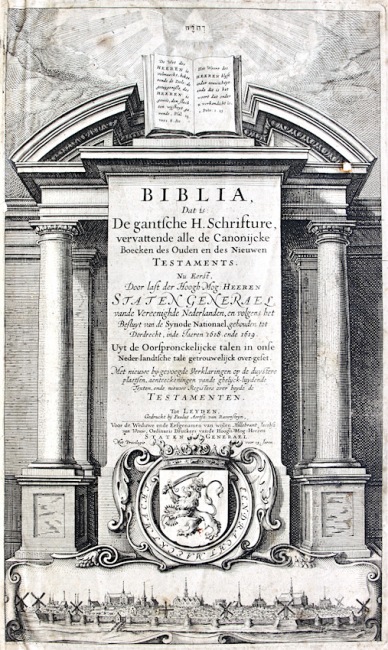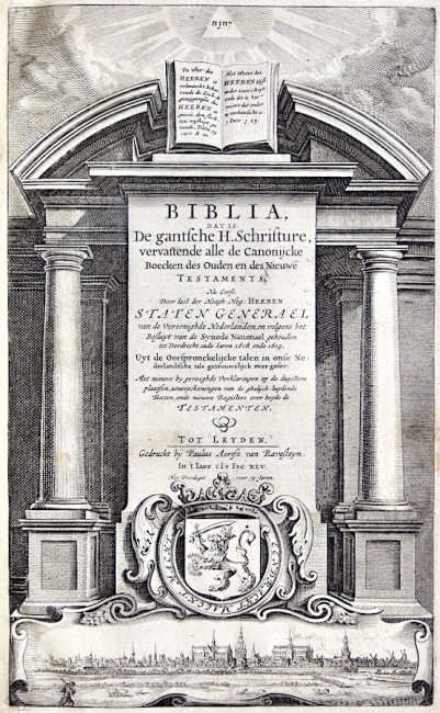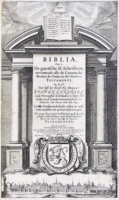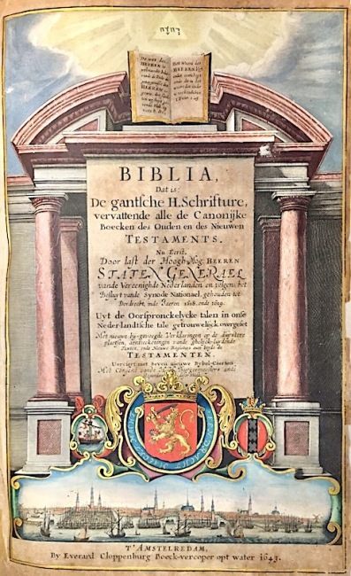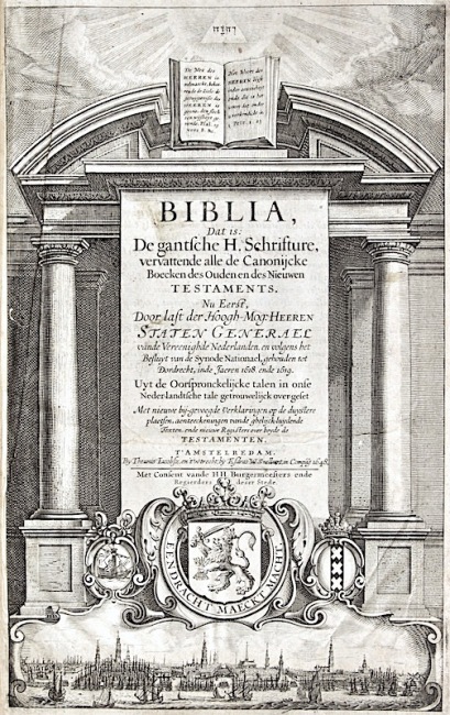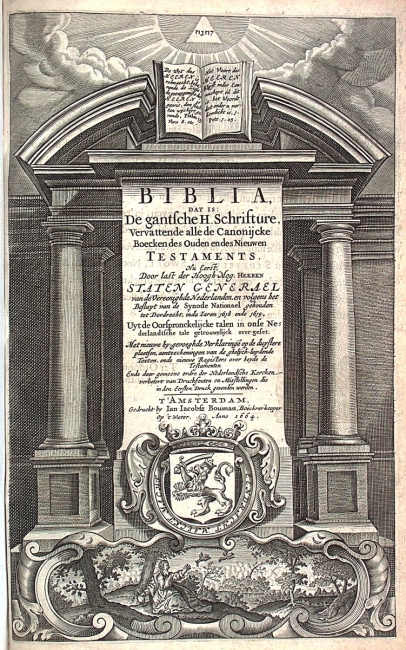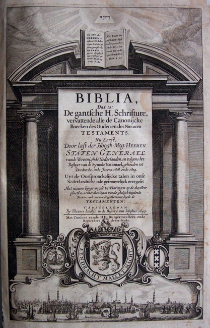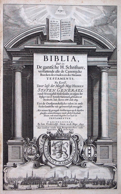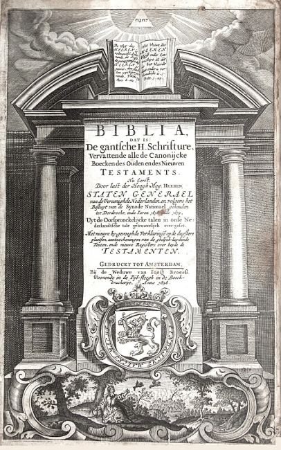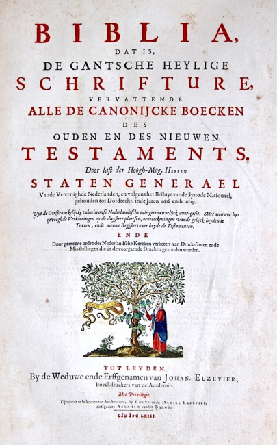 Statenbijbel uitgegeven in 1663 door de weduwe en de erfgenamen van Johan Elzevier in Leiden. Een goudgehoogd Tetragram werd in de zon op de titelgravure door een professioneel meestercolorist in manuscript aangebracht: