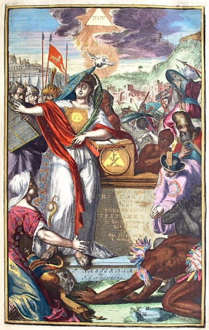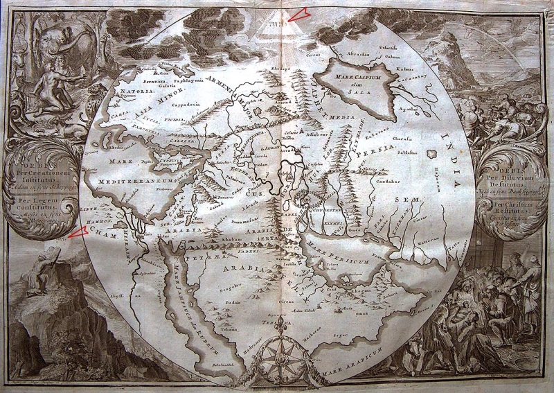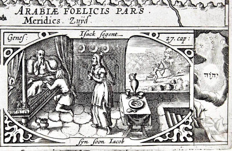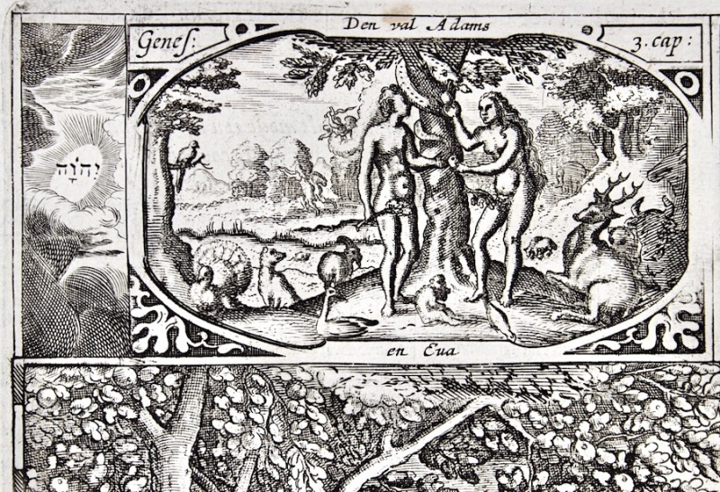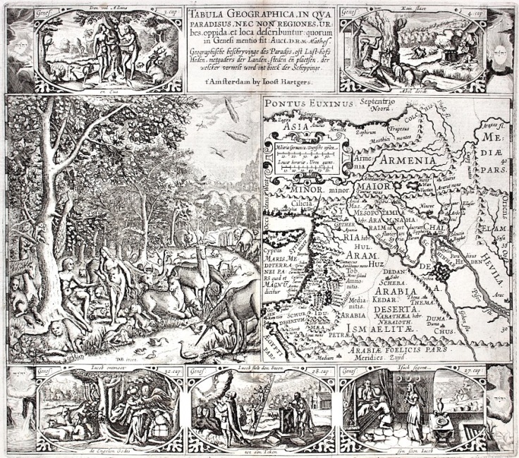 Bovenstaande uitgave van Joost Hartgers bevat een serie bijbelse kaarten, waaronder de kaart van het ‘Paradys’. De verticale kaders in de hoeken bevatten het Tetragram (JHWH):