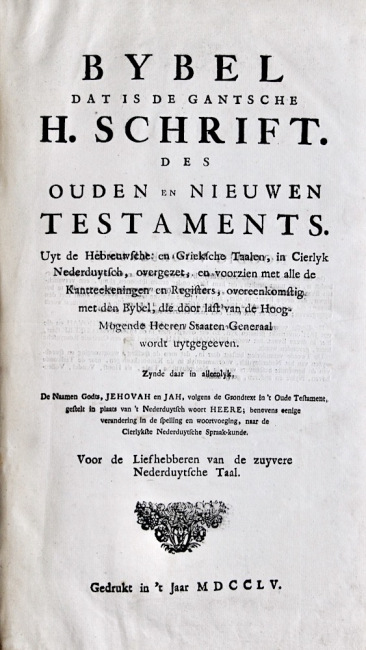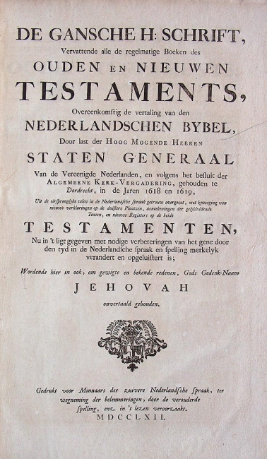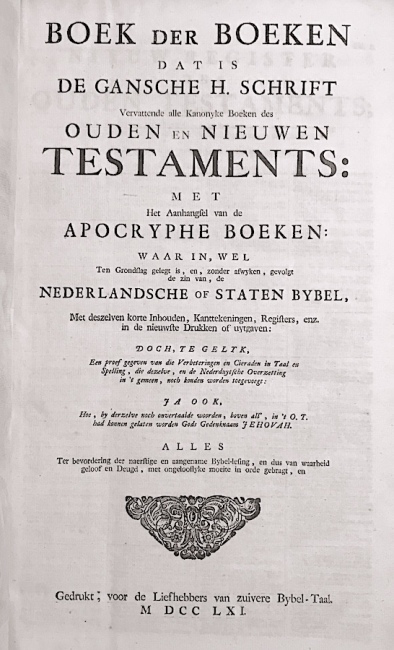 De JEHOVAHBIJBEL, een aangepaste editie van de Statenvertaling, waarvan acht verschillende titelbladen ontdekt zijn: 1755 (3x), 1756, 1761 en 1762 (3x):