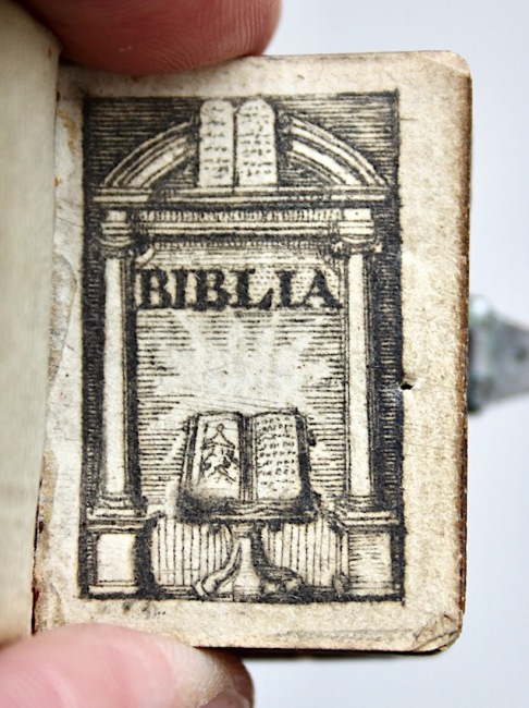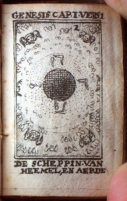 Miniatuurbijbeltje gedrukt bij D. Langeweg te ’s Gravenhage in ca. 1750 (4,0 x 3,1 cm) Het Tetragram verwerkt in scheppingsgravure: