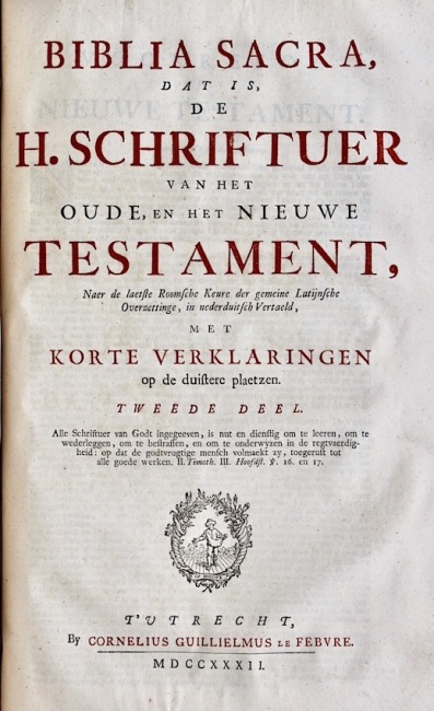 Titel: BIBLIA SACRA, Dat is, De H. Schriftuer… Vertaling/Benaming: Andreas van der Schuur Drukker/Uitgever: Cornelius Guillielmus le Febvre, Utrecht Gebruik Godsnaam: Tetragrammaton in titelgravure & ‘Jehova’ in kanttekeningen