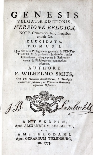 Titel: BIBLIA SACRA, Vulgatae Editionis versione BELGICA Vertaling/Benaming: Wilhelmus Smits Drukker/Uitgever: Antwerpen: A. Everaerts / Amsterdam… Gebruik Godsnaam: ‘Jehova’, enkel in de verklarende commentaren