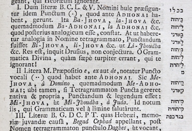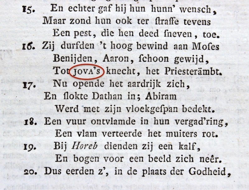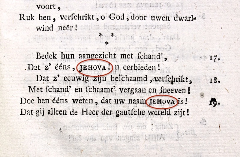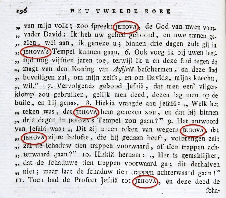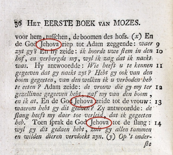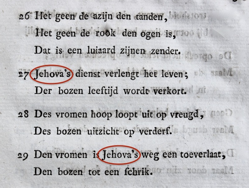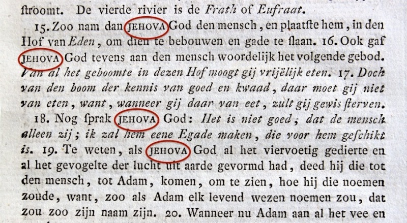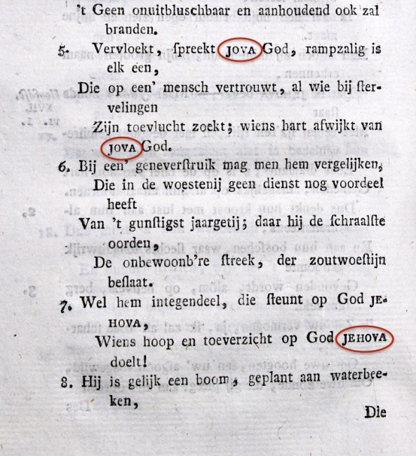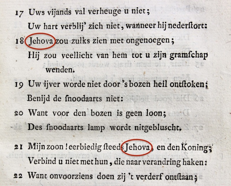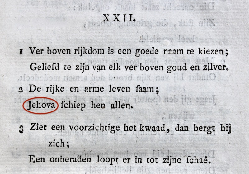 Titel: BIBLIA, De geheele H. Schriftuur… Vertaling/Benaming: Aegidius (Gilles) De Witte Drukker/Uitgever: Theodorus vanden Eynden, Utrecht Gebruik Godsnaam: ‘Jova’ in de Bijbeltekst (1x in Exodus 6:3) HET NIEUWE TESTAMENT, Uitgegeven bij Jan Stichter te Antwerpen in 1702 Gebruik Godsnaam: Het Tetragrammaton verwerkt in het drukkersvignet