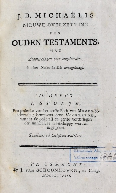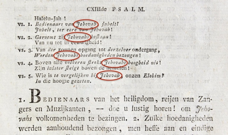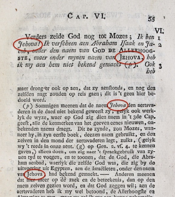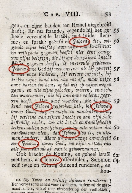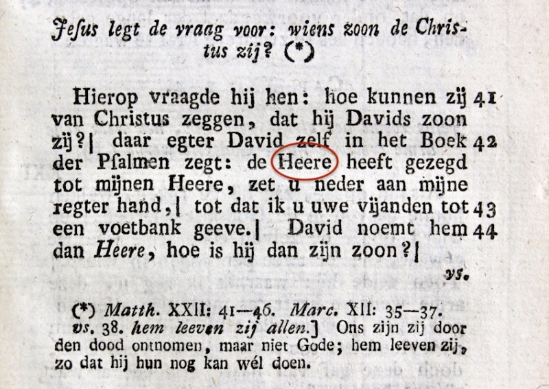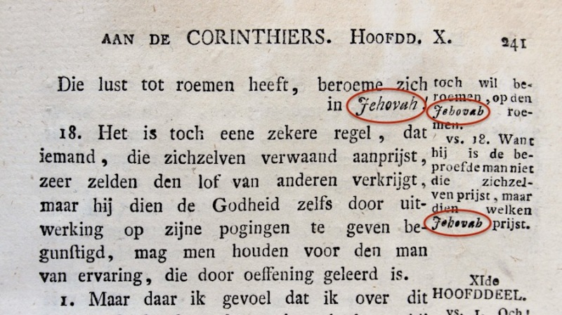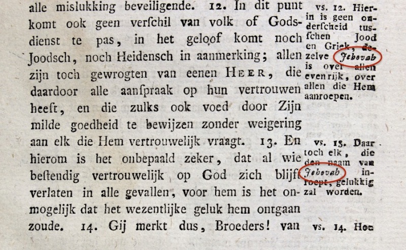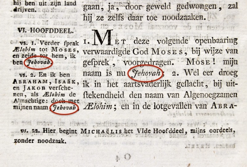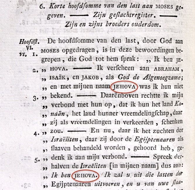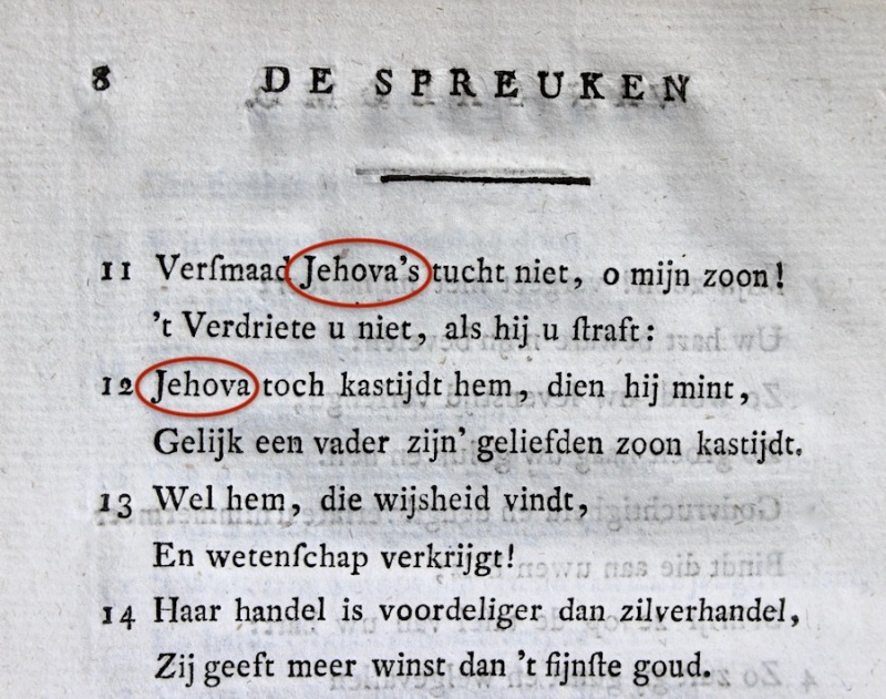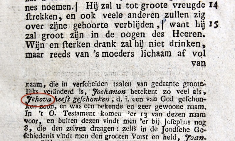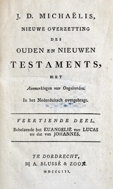 Titel: Nieuwe overzetting des Ouden en Nieuwen Testaments Vertaling/Benaming: J.D. Michaëlis Drukker/Uitgever: J. van Schoonhoven & Comp., Utrecht Gebruik Godsnaam: ‘Jehova’ en ‘Jehovah’ in de Bijbeltekst NIEUWE TESTAMENT; Nieuwe overzetting des Ouden en Nieuwen Testaments, […]. Deel 14: Evangelie van Lucas en Johannes, 1803 Gebruik Godsnaam: ‘Heere’ in de Bijbeltekst, ‘Jehova’ in sommige kanttekeningen
