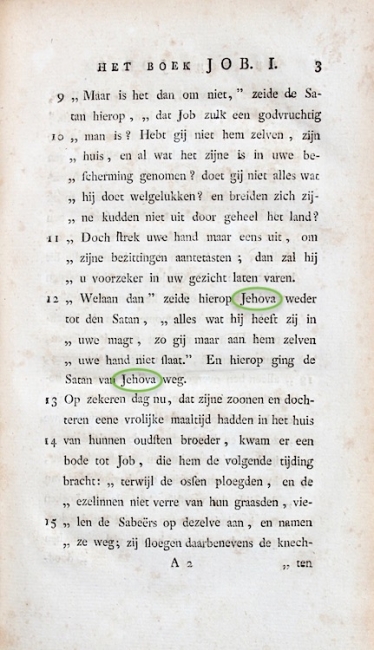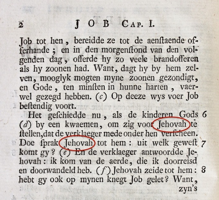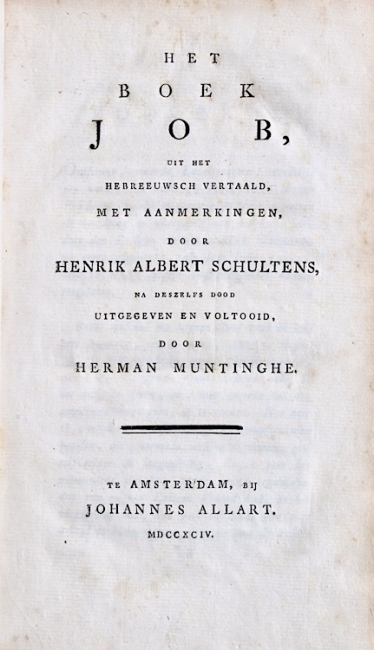 Titel: Het boek Job Vertaling/Benaming: Hendrik Albert Schultens Drukker/Uitgever: Johannes Allart, Amsterdam Gebruik Godsnaam: ‘Jehova’ in de Bijbeltekst