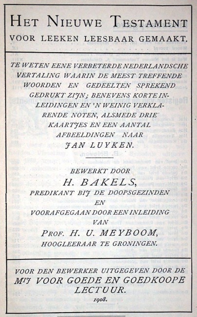 Titel: Het Nieuwe Testament Vertaling/Benaming: H. Bakels Drukker/Uitgever: Maatschappij voor goede en goedkoope lectuur Gebruik Godsnaam: ‘Jehovah’ in de Bijbeltekst (2e druk, 1Cor. 10:21, 22) en ‘Jehova’ in de verklarende voetnoten