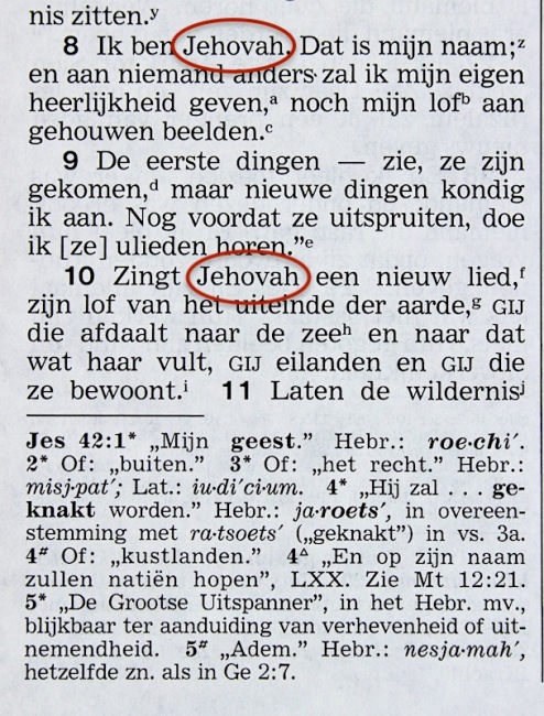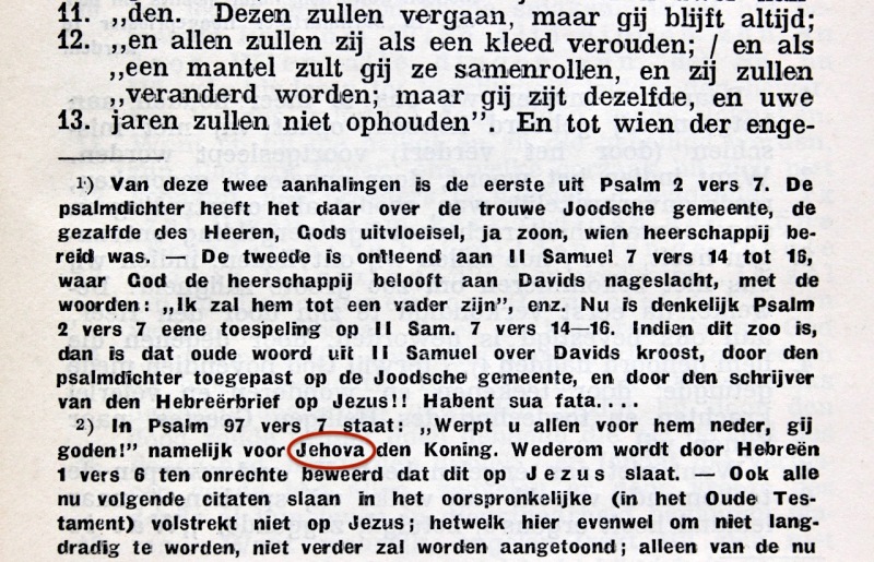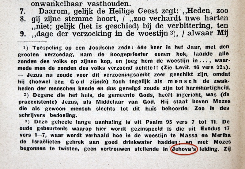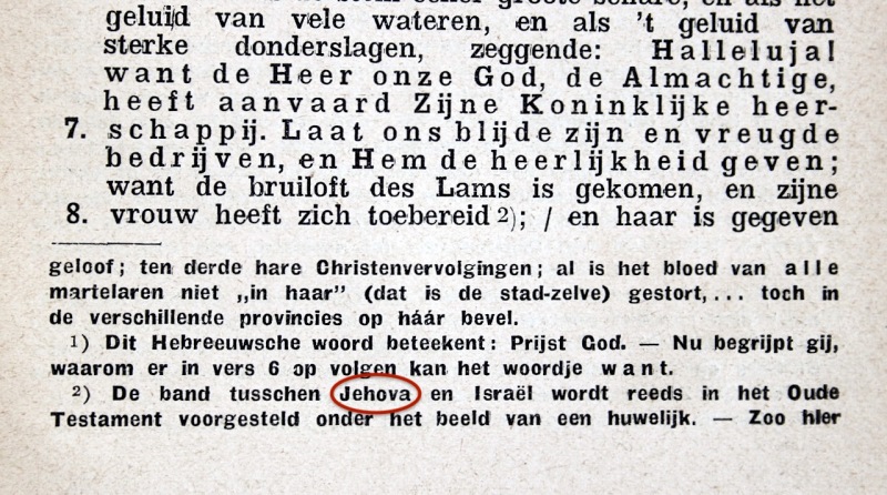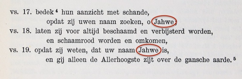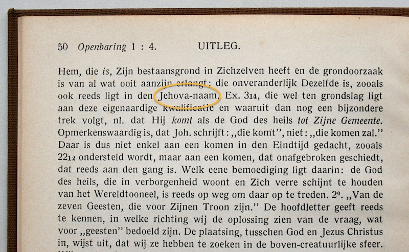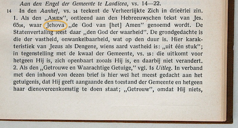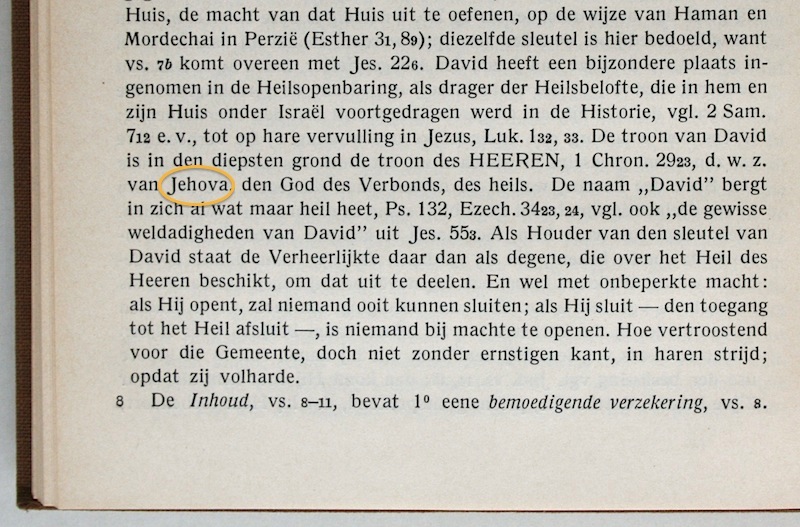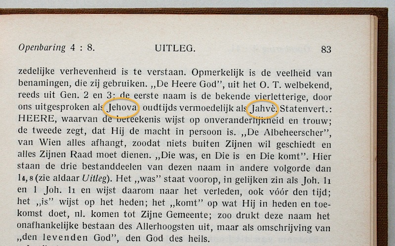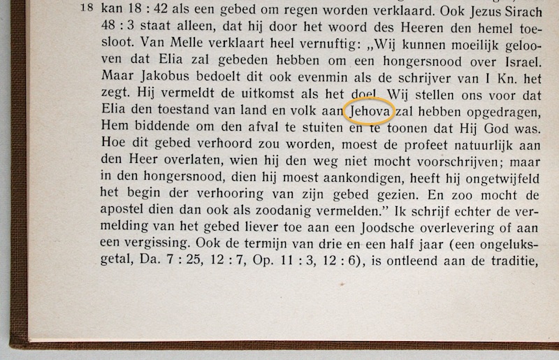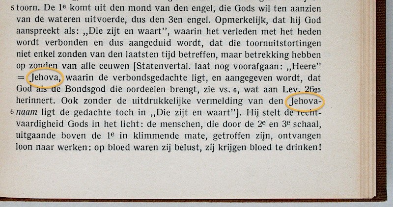 Titel: Serie ‘Tekst & Uitleg’ : Praktische Bijbelverklaring (39 delen) Vertaling/Benaming: F.M.Th. Böhl & A. van Veldhuizen Drukker/Uitgever: J.B. Wolters, Den Haag Gebruik Godsnaam: ‘Jehova’ als ‘Jahvè’ in Bijbeltekst en commentaren