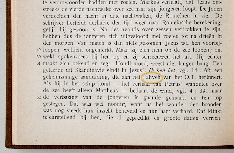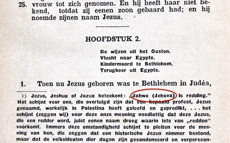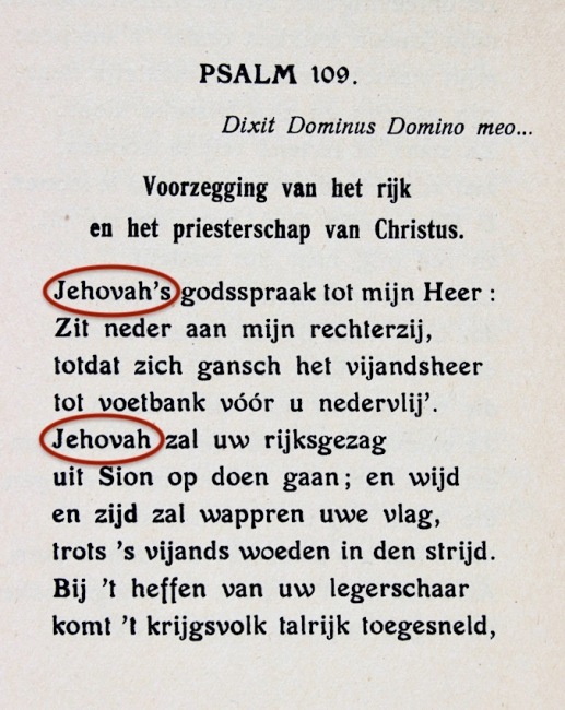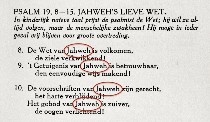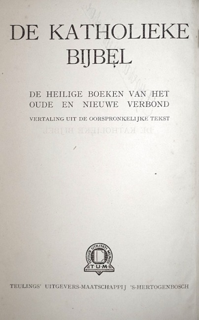 Titel: De Katholieke Bijbel Vertaling/Benaming: L. Himmelreich & C. Smits Drukker/Uitgever: Teulings, ’s Hertogenbosch Gebruik Godsnaam: ‘Jahve’ in de Bijbeltekst