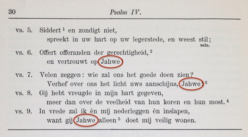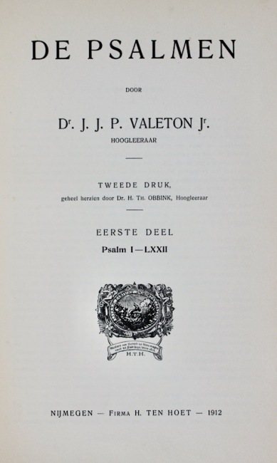 Titel: De Psalmen Vertaling/Benaming: J.J.P. Valeton Jr. Drukker/Uitgever: Firma H. ten Hoet, Nijmegen (Tweede druk) Gebruik Godsnaam: ‘Jahwe’ in de tekst