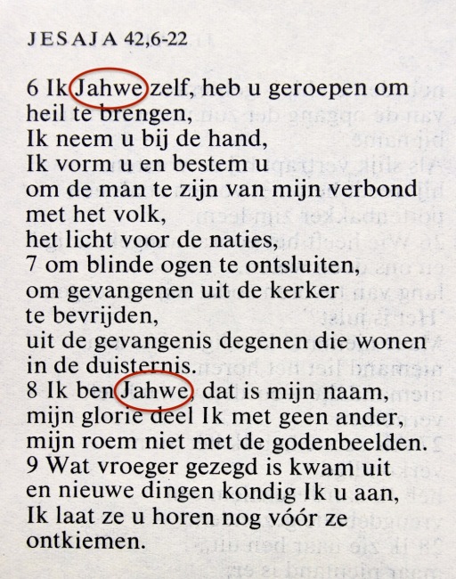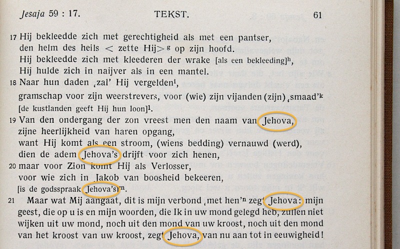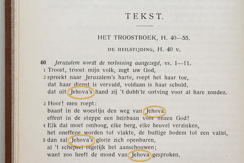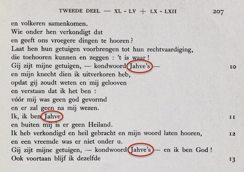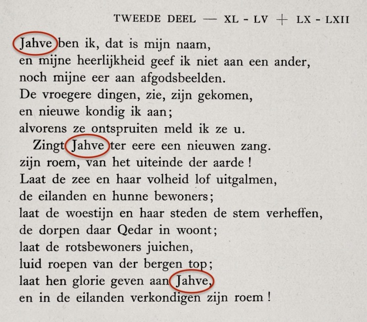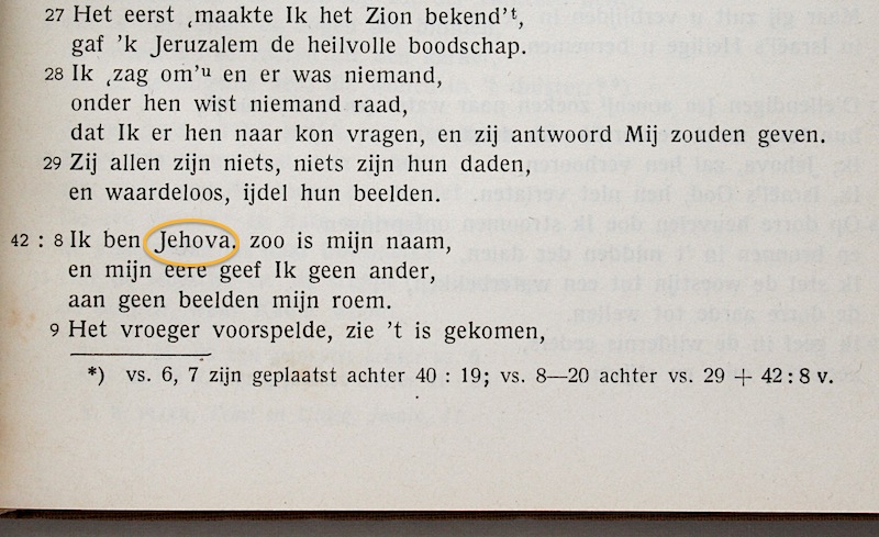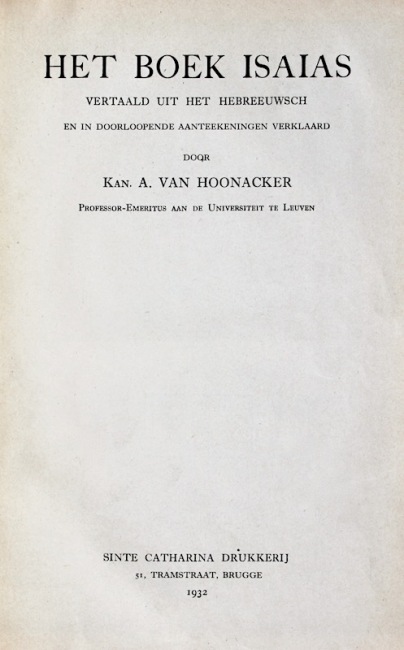 Titel: Het Boek Isaias Vertaling/Benaming: A. Van Hoonacker Drukker/Uitgever: Sinte Katharina drukkerij, Brugge Gebruik Godsnaam: ‘Jahve’ in de Bijbeltekst