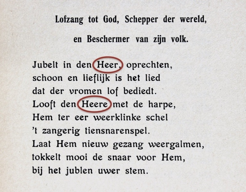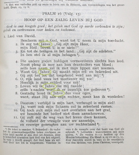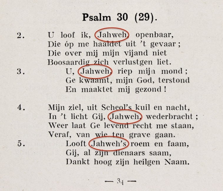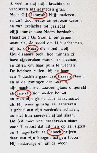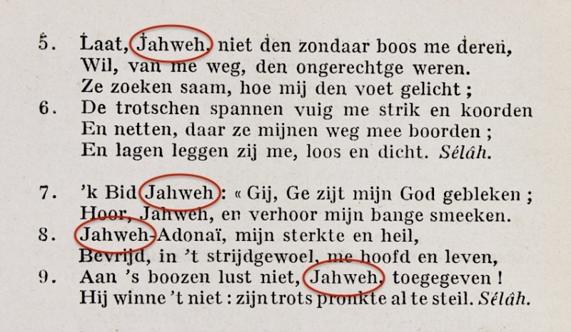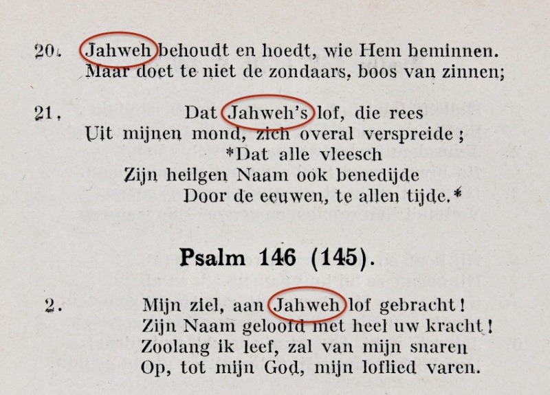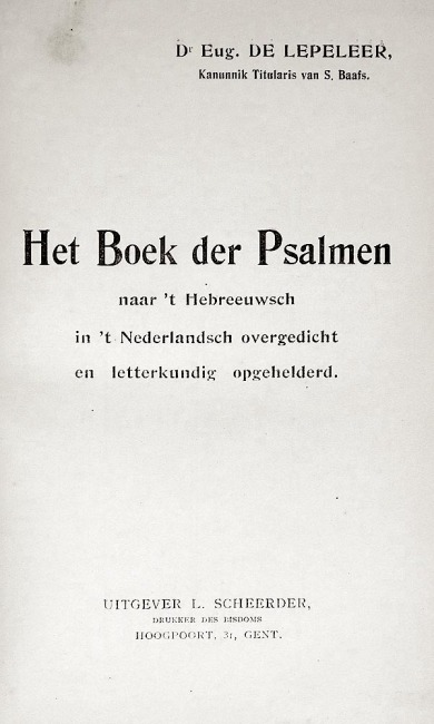 Titel: Het Boek der Psalmen Vertaling/Benaming: E. De Lepeleer Drukker/Uitgever: L. Scheerder, Gent Gebruik Godsnaam: ‘Jahweh’ in de Bijbeltekst