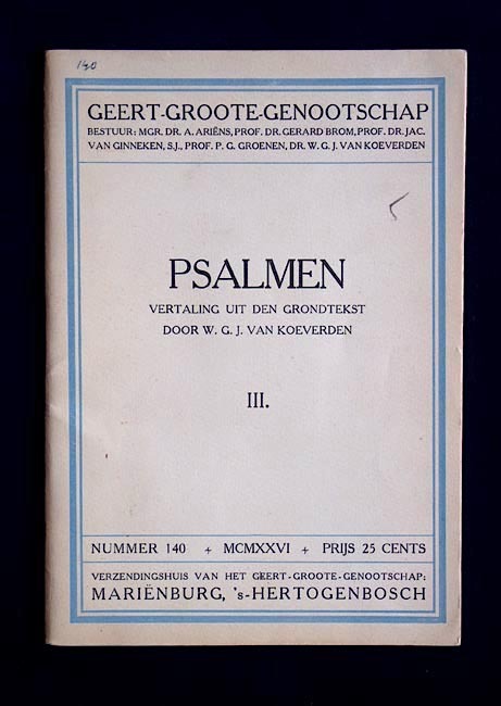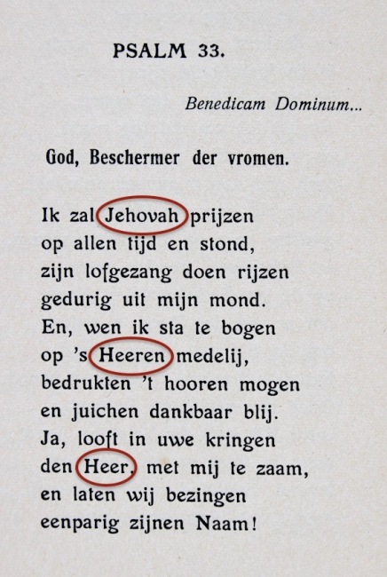 Titel: Psalmen Vertaling/Benaming: W.G.J. van Koeverden Drukker/Uitgever: Geert-Groote-Genootschap Gebruik Godsnaam: ‘Jahweh’ en ‘Heer’ in de Bijbeltekst