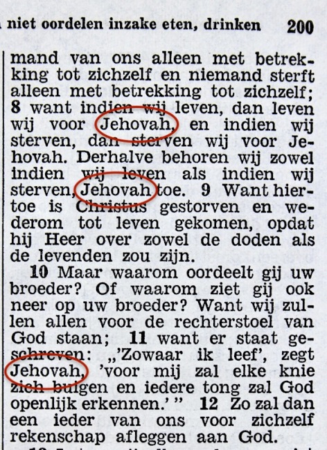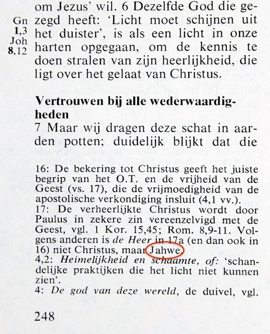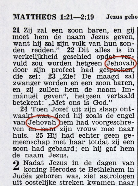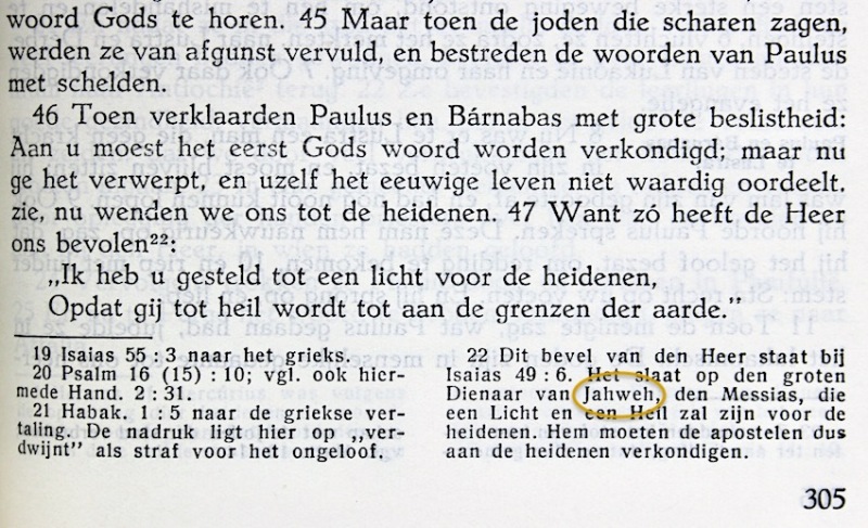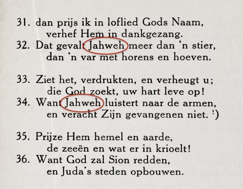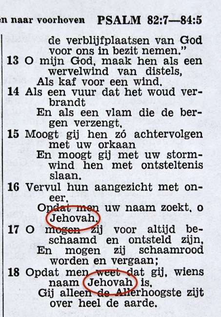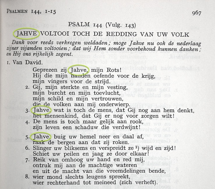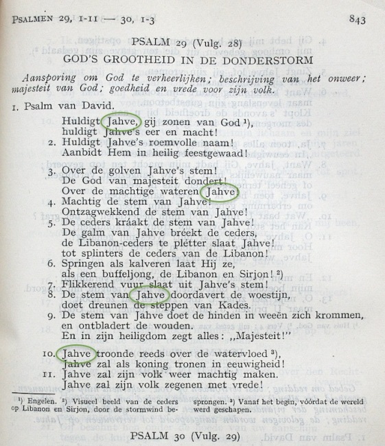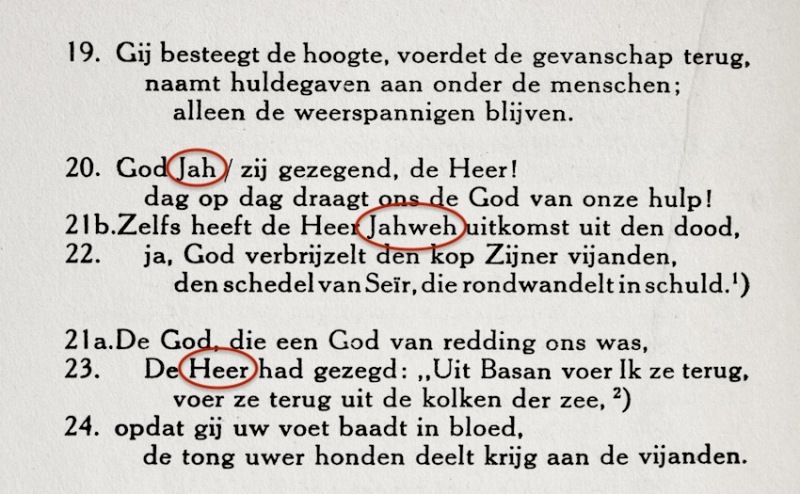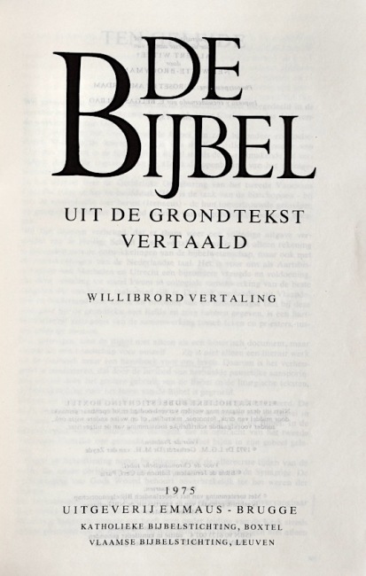 Titel: De Bijbel, uit de grondtekst vertaald… Vertaling/Benaming: Willibrordvertaling Drukker/Uitgever: Katholieke Bijbelstichting, Boxtel Gebruik Godsnaam: ‘Jahwe’ in het Oude Testament en in de kanttekeningen bij het Nieuwe Testament; ‘Heer’ in de Psalmen