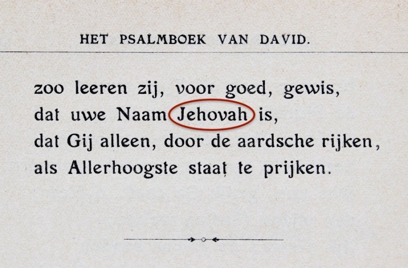 Titel: Het Psalmboek van David Vertaling/Benaming: D. Verbeeck Drukker/Uitgever: Wittembercq, Brussel Gebruik Godsnaam: In de Bijbeltekst: ‘Jahveh’ en ‘Jehovah’, maar ook weergaven als ‘Heer’, Heere’ en ‘Heeren’