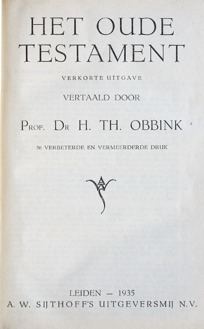 Titel: Het Oude Testament Vertaling/Benaming: Utrechtse Vertaling [H. TH. Obbink] Drukker/Uitgever: A.W. Sijthoff’s Uitgeversmij N.V., Leiden Gebruik Godsnaam: HEER, HEERE en ‘des HEEREN’. Ook ‘Jahveh’ en ‘Jahwe’ in de tekst tussen rechte teksthaken, en kanttekeningen