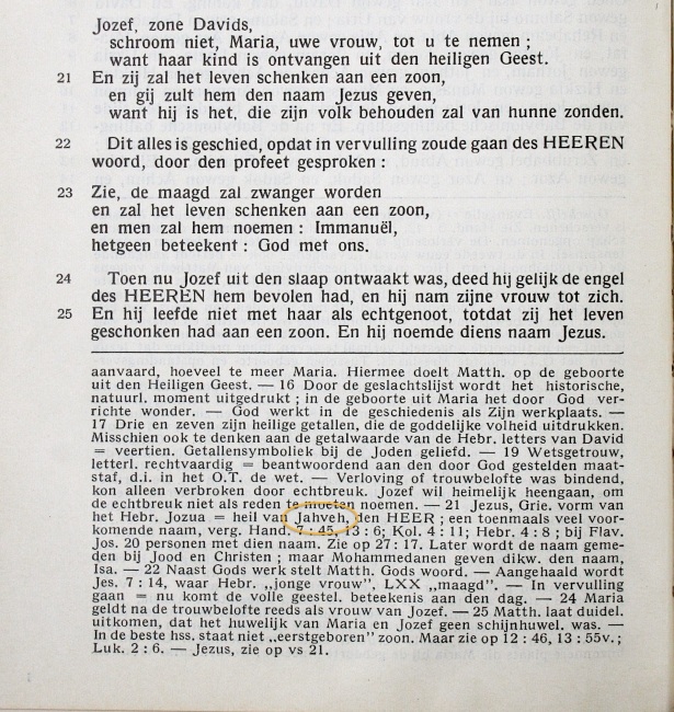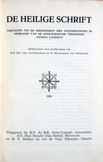 Titel: De Heilige Schrift Vertaling/Benaming: In opdracht van de apologetische vereniging ‘Petrus Canisius’ of Canisiusvertaling Drukker/Uitgever: R.K. Boek-Centrale, Amsterdam Gebruik Godsnaam: ‘Jahweh’ in de Bijbeltekst en in kanttekeningen bij het Nieuwe Testament