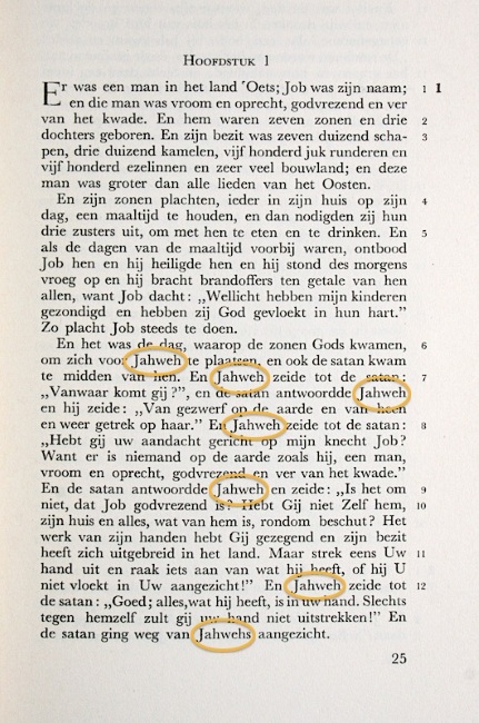 Titel: Het Boek Job Vertaling/Benaming: A. Gans Drukker/Uitgever: A.W. Sijthoff’s uitgeversmaatschappij Gebruik Godsnaam: ‘Jahweh’ in de tekst