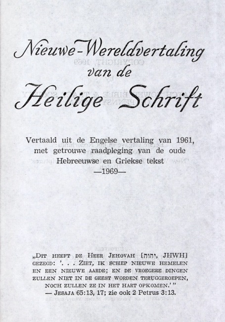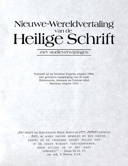 Titel: Nieuwe-Wereldvertaling van de Heilige Schrift Vertaling/Benaming: Nieuwe-Wereldvertaling Drukker/Uitgever: Watchtower Bible and Tract Society Gebruik Godsnaam: ‘Jehovah’ in de complete Bijbel