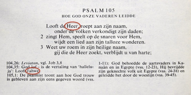 Gebruik Godsnaam: HEERE en Heer, ‘Jahveh’ in kanttekeningen. Bij citaten uit het Oude Testament: HEERE verwijzend naar God; verwijzend naar Jezus: Heer (bv. Lukas 20:42, 43).