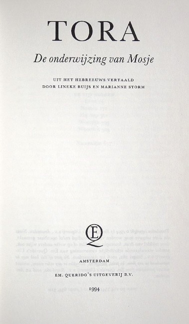 Titel: TORA, De onderwijzing van Mosje Vertaling/Benaming: Lineke Buijs en Marianne Storm Drukker/Uitgever: Querido’s Uitgeverij, Amsterdam Gebruik Godsnaam: ‘JHWH’ in de Bijbeltekst