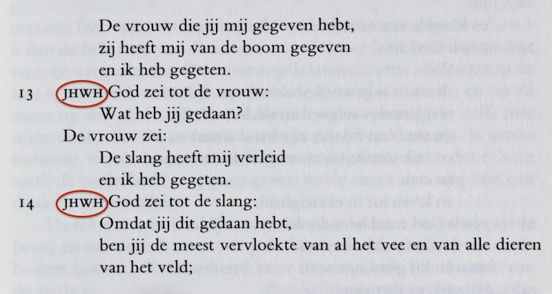 Titel: Verhalen over het begin (Genesis 1-11) Vertaling/Benaming: Ellen van Wolde Drukker/Uitgever: Ten Have, Baarn Gebruik Godsnaam: ‘JHWH’ in de Bijbeltekst