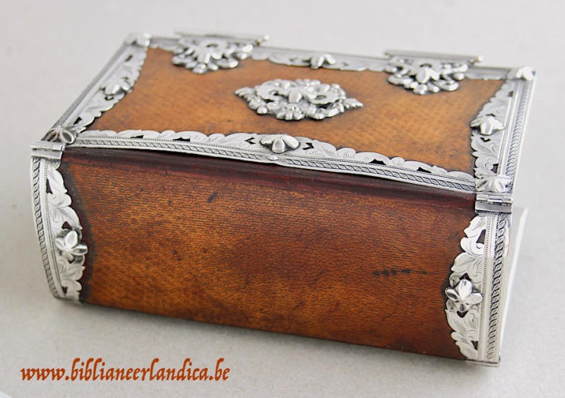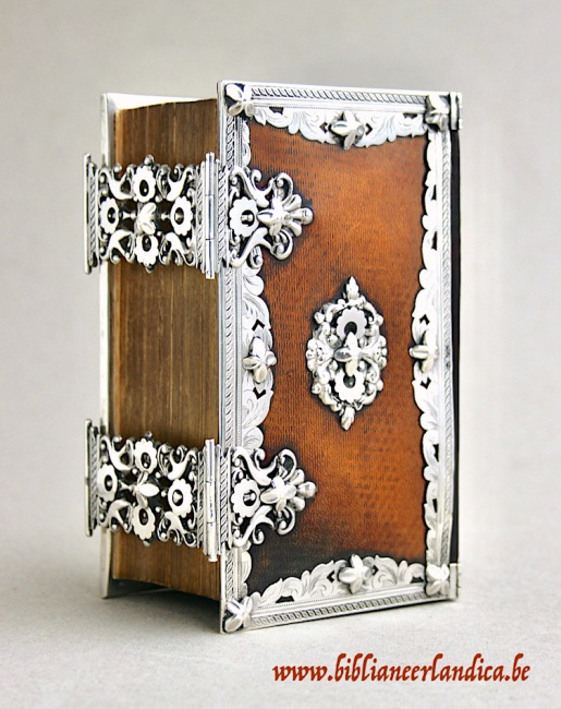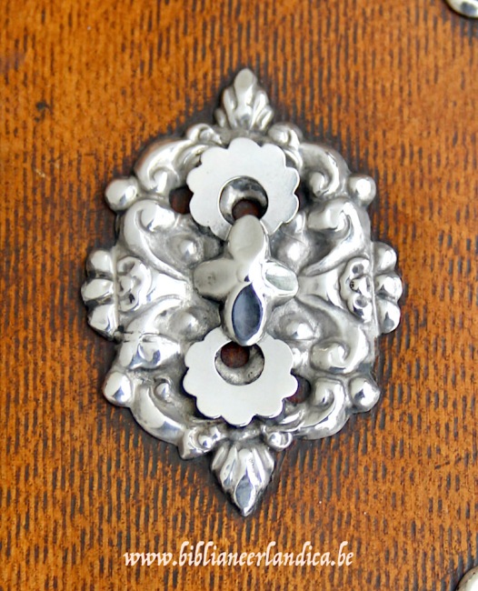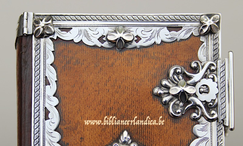 Het beslag van dit schitterende praalbandje werd vervaardigd door Hendrik Adema, die van 1846 tot 1873 in het Friese Ljouwerd (Leeuwarden) gevestigd was. De opengewerkte boeksloten zijn prachtig vormgegeven met ornamentele motieven. De randen lopen naar het centrum breed uit, bevatten gegraveerde florale motiefjes en zijn fijn afgeboord met een parelrandje en bredere kabellijn. Zowel de boeksloten als middenstukken zijn versierd met appliqués in de vorm van zachtgekartelde ringetjes. Protectie staat voorop doordat het beslag langs alle zijden voorzien is van buffers in de vorm van bloemetjes. Maar hun aanwezigheid op de boeksloten en rugbeschermers geven ze ook een exclusief decoratieve functie. Met dit heilig boek als werkstuk leverde Adema een prachtig staaltje van vakkundig meesterschap af. Een lust voor het oog!
